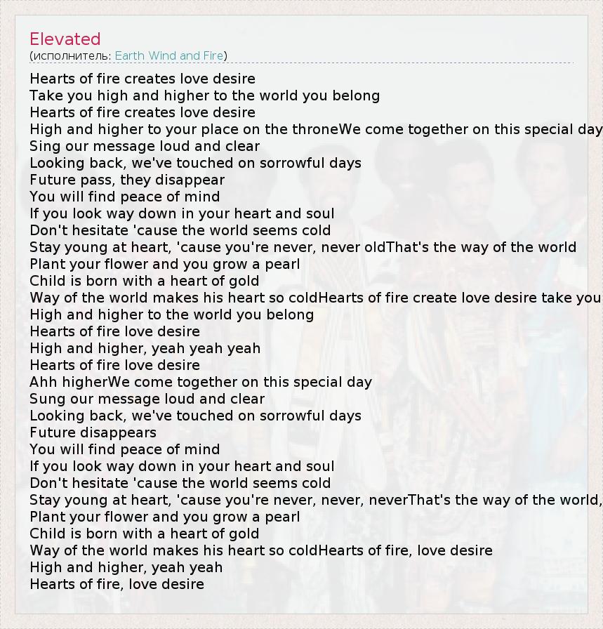 Hearts of fire creates love desire Take you high and higher to the world you belong Hearts of fire creates love desire High and higher to your place on the throneWe come together on this special day Sing our message loud and clear Looking back, we've touched on sorrowful days Future pass, they disappear You will find peace of mind If you look way down in your heart and soul Don't hesitate 'cause the world seems cold Stay young at heart, 'cause you're never, never oldThat's the way of the world Plant your flower and you grow a pearl Child is born with a heart of gold Way of the world makes his heart so coldHearts of fire create love desire take you High and higher to the world you belong Hearts of fire love desire High and higher, yeah yeah yeah Hearts of fire love desire Ahh higherWe come together on this special day Sung our message loud and clear Looking back, we've touched on sorrowful days Future disappears You will find peace of mind If you look way down in your heart and soul Don't hesitate 'cause the world seems cold Stay young at heart, 'cause you're never, never, neverThat's the way of the world, Plant your flower and you grow a pearl Child is born with a heart of gold Way of the world makes his heart so coldHearts of fire, love desire High and higher, yeah yeah Hearts of fire, love desire