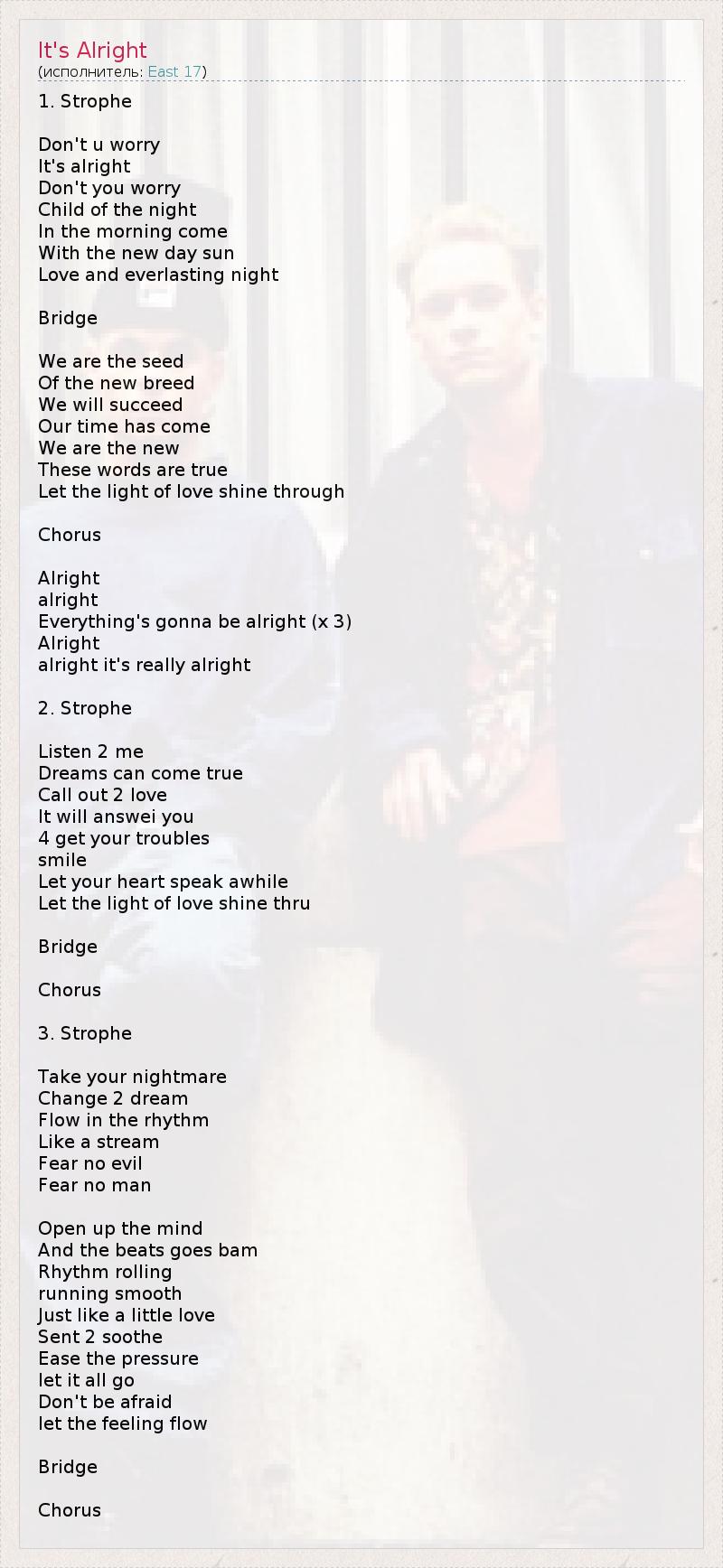 1. Strophe Don't u worry It's alright Don't you worry Child of the night In the morning come With the new day sun Love and everlasting night Bridge We are the seed Of the new breed We will succeed Our time has come We are the new These words are true Let the light of love shine through Chorus Alright alright Everything's gonna be alright (x 3) Alright alright it's really alright 2. Strophe Listen 2 me Dreams can come true Call out 2 love It will answei you 4 get your troubles smile Let your heart speak awhile Let the light of love shine thru Bridge Chorus 3. Strophe Take your nightmare Change 2 dream Flow in the rhythm Like a stream Fear no evil Fear no man Open up the mind And the beats goes bam Rhythm rolling running smooth Just like a little love Sent 2 soothe Ease the pressure let it all go Don't be afraid let the feeling flow Bridge Chorus