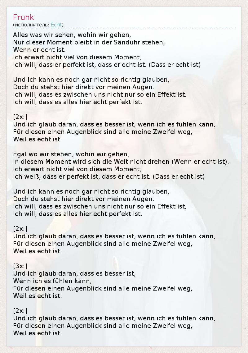 Alles was wir sehen, wohin wir gehen, Nur dieser Moment bleibt in der Sanduhr stehen, Wenn er echt ist. Ich erwart nicht viel von diesem Moment, Ich will, dass er perfekt ist, dass er echt ist. (Dass er echt ist) Und ich kann es noch gar nicht so richtig glauben, Doch du stehst hier direkt vor meinen Augen. Ich will, dass es zwischen uns nicht nur so ein Effekt ist. Ich will, dass es alles hier echt perfekt ist. [2x:] Und ich glaub daran, dass es besser ist, wenn ich es fühlen kann, Für diesen einen Augenblick sind alle meine Zweifel weg, Weil es echt ist. Egal wo wir stehen, wohin wir gehen, In diesem Moment wird sich die Welt nicht drehen (Wenn er echt ist). Ich erwart nicht viel von diesem Moment, Ich weiß, dass er perfekt ist, dass er echt ist. (Dass er echt ist) Und ich kann es noch gar nicht so richtig glauben, Doch du stehst hier direkt vor meinen Augen. Ich will, dass es zwischen uns nicht nur so ein Effekt ist, Ich will, dass es alles hier echt perfekt ist. [2x:] Und ich glaub daran, dass es besser ist, wenn ich es fühlen kann, Für diesen einen Augenblick sind alle meine Zweifel weg, Weil es echt ist. [3x:] Und ich glaub daran, dass es besser ist, Wenn ich es fühlen kann, Für diesen einen Augenblick sind alle meine Zweifel weg, Weil es echt ist. [2x:] Und ich glaub daran, dass es besser ist, wenn ich es fühlen kann, Für diesen einen Augenblick sind alle meine Zweifel weg, Weil es echt ist.