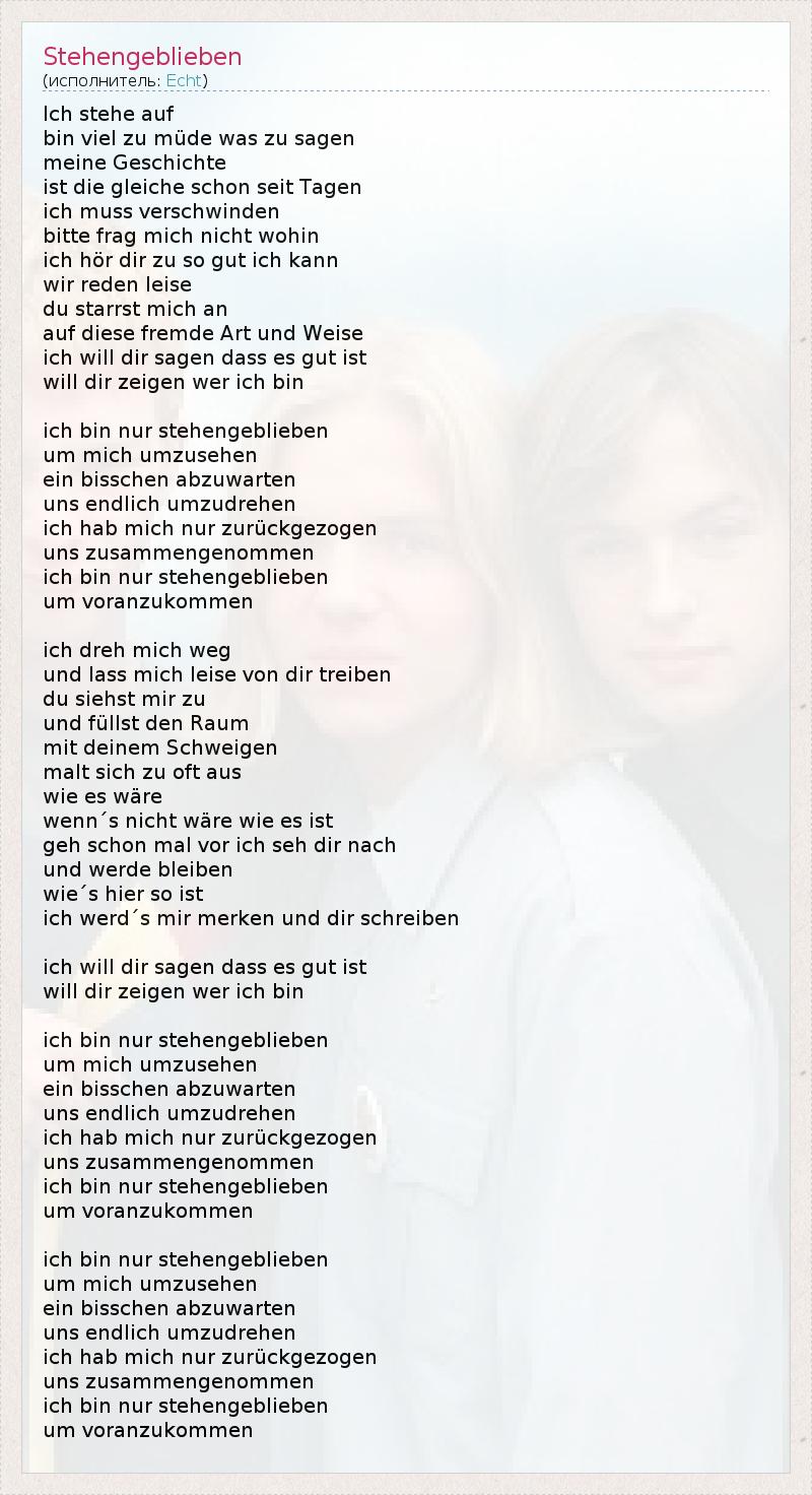 Ich stehe Ауф бен Вьель цу MUDE был цу Sagen Meine Geschichte IST умереть gleiche Schön Сеит Tagen ич -массового verschwinden Bitte осколочная Mich Nicht Wohin ич Ор реж цу так кишка Ich Канн WIR Reden Leise Du starrst Mich Ауф Diese Fremde Art унд Weise Ich Will DIR Sagen DASS эс кишечника ист будет DIR Срезы WER ич бен ич бен нур stehengeblieben гм Mich umzusehen Эйн bisschen abzuwarten UNS Endlich umzudrehen ич Жил Mich нур zurückgezogen UNS zusammengenommen ич бен нур stehengeblieben гм voranzukommen ич DREH Mich Weg унд девушка Mich Leise фон реж treiben Du siehst мир цу унд füllst ден Raum мит deinem Schweigen солод Сич цу часто AUS Wie -эс- Ware wenn's Nicht посуды Wie эс ист GEH Шон мал вор ич SEH реж нач унд Werde bleiben wie's Хир так ист ич werd's мир Merken унд реж Schreiben Ich Will DIR Sagen DASS эс кишечника ист будет DIR Срезы WER ич бен ич бен нур stehengeblieben гм Mich umzusehen Эйн bisschen abzuwarten UNS Endlich umzudrehen ич Жил Mich нур zurückgezogen UNS zusammengenommen ич бен нур stehengeblieben гм voranzukommen ич бен нур stehengeblieben гм Mich umzusehen Эйн bisschen abzuwarten UNS Endlich umzudrehen ич Жил Mich нур zurückgezogen UNS zusammengenommen ич бен нур stehengeblieben гм voranzukommen