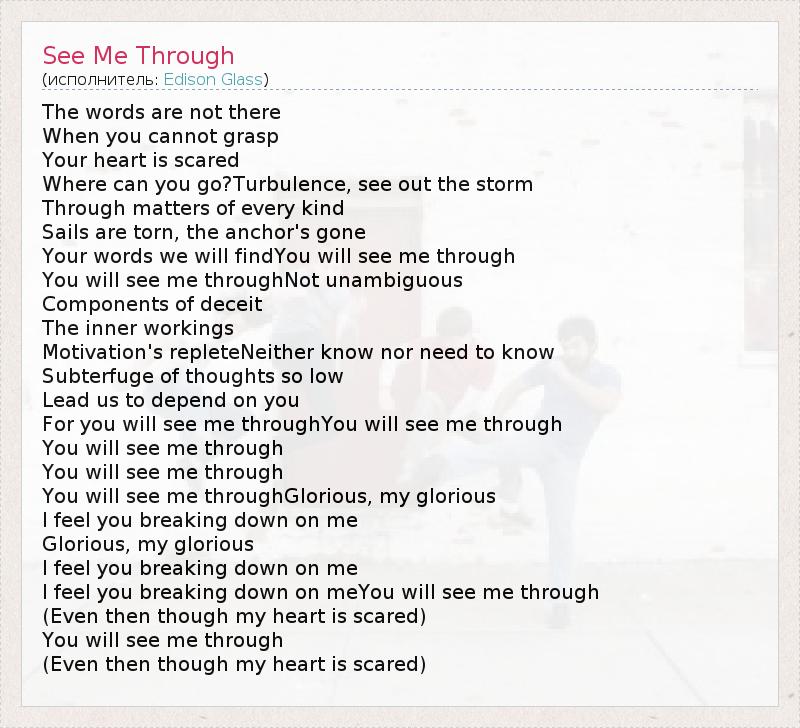 The words are not there When you cannot grasp Your heart is scared Where can you go?Turbulence, see out the storm Through matters of every kind Sails are torn, the anchor's gone Your words we will findYou will see me through You will see me throughNot unambiguous Components of deceit The inner workings Motivation's repleteNeither know nor need to know Subterfuge of thoughts so low Lead us to depend on you For you will see me throughYou will see me through You will see me through You will see me through You will see me throughGlorious, my glorious I feel you breaking down on me Glorious, my glorious I feel you breaking down on me I feel you breaking down on meYou will see me through (Even then though my heart is scared) You will see me through (Even then though my heart is scared)