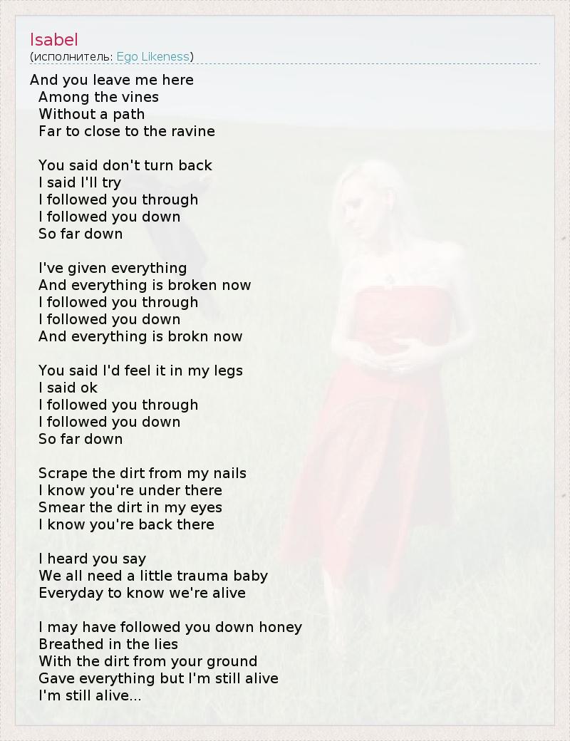 And you leave me here Among the vines Without a path Far to close to the ravine You said don't turn back I said I'll try I followed you through I followed you down So far down I've given everything And everything is broken now I followed you through I followed you down And everything is brokn now You said I'd feel it in my legs I said ok I followed you through I followed you down So far down Scrape the dirt from my nails I know you're under there Smear the dirt in my eyes I know you're back there I heard you say We all need a little trauma baby Everyday to know we're alive I may have followed you down honey Breathed in the lies With the dirt from your ground Gave everything but I'm still alive I'm still alive...