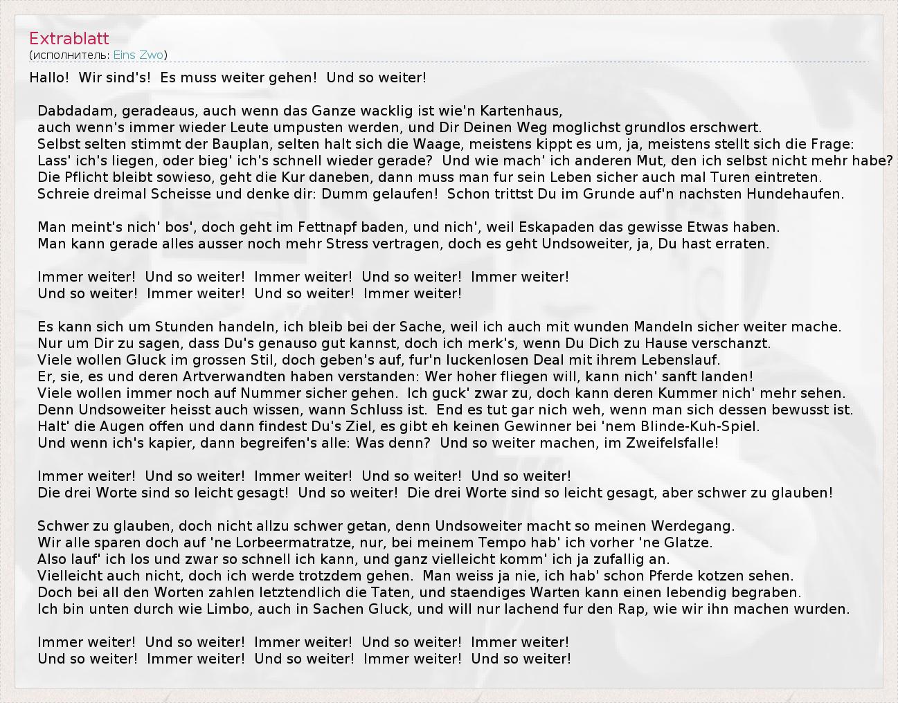 Hallo! Wir sind's! Es muss weiter gehen! Und so weiter! Dabdadam, geradeaus, auch wenn das Ganze wacklig ist wie'n Kartenhaus, auch wenn's immer wieder Leute umpusten werden, und Dir Deinen Weg moglichst grundlos erschwert. Selbst selten stimmt der Bauplan, selten halt sich die Waage, meistens kippt es um, ja, meistens stellt sich die Frage: Lass' ich's liegen, oder bieg' ich's schnell wieder gerade? Und wie mach' ich anderen Mut, den ich selbst nicht mehr habe? Die Pflicht bleibt sowieso, geht die Kur daneben, dann muss man fur sein Leben sicher auch mal Turen eintreten. Schreie dreimal Scheisse und denke dir: Dumm gelaufen! Schon trittst Du im Grunde auf'n nachsten Hundehaufen. Man meint's nich' bos', doch geht im Fettnapf baden, und nich', weil Eskapaden das gewisse Etwas haben. Man kann gerade alles ausser noch mehr Stress vertragen, doch es geht Undsoweiter, ja, Du hast erraten. Immer weiter! Und so weiter! Immer weiter! Und so weiter! Immer weiter! Und so weiter! Immer weiter! Und so weiter! Immer weiter! Es kann sich um Stunden handeln, ich bleib bei der Sache, weil ich auch mit wunden Mandeln sicher weiter mache. Nur um Dir zu sagen, dass Du's genauso gut kannst, doch ich merk's, wenn Du Dich zu Hause verschanzt. Viele wollen Gluck im grossen Stil, doch geben's auf, fur'n luckenlosen Deal mit ihrem Lebenslauf. Er, sie, es und deren Artverwandten haben verstanden: Wer hoher fliegen will, kann nich' sanft landen! Viele wollen immer noch auf Nummer sicher gehen. Ich guck' zwar zu, doch kann deren Kummer nich' mehr sehen. Denn Undsoweiter heisst auch wissen, wann Schluss ist. End es tut gar nich weh, wenn man sich dessen bewusst ist. Halt' die Augen offen und dann findest Du's Ziel, es gibt eh keinen Gewinner bei 'nem Blinde-Kuh-Spiel. Und wenn ich's kapier, dann begreifen's alle: Was denn? Und so weiter machen, im Zweifelsfalle! Immer weiter! Und so weiter! Immer weiter! Und so weiter! Und so weiter! Die drei Worte sind so leicht gesagt! Und so weiter! Die drei Worte sind so leicht gesagt, aber schwer zu glauben! Schwer zu glauben, doch nicht allzu schwer getan, denn Undsoweiter macht so meinen Werdegang. Wir alle sparen doch auf 'ne Lorbeermatratze, nur, bei meinem Tempo hab' ich vorher 'ne Glatze. Also lauf' ich los und zwar so schnell ich kann, und ganz vielleicht komm' ich ja zufallig an. Vielleicht auch nicht, doch ich werde trotzdem gehen. Man weiss ja nie, ich hab' schon Pferde kotzen sehen. Doch bei all den Worten zahlen letztendlich die Taten, und staendiges Warten kann einen lebendig begraben. Ich bin unten durch wie Limbo, auch in Sachen Gluck, und will nur lachend fur den Rap, wie wir ihn machen wurden. Immer weiter! Und so weiter! Immer weiter! Und so weiter! Immer weiter! Und so weiter! Immer weiter! Und so weiter! Immer weiter! Und so weiter!