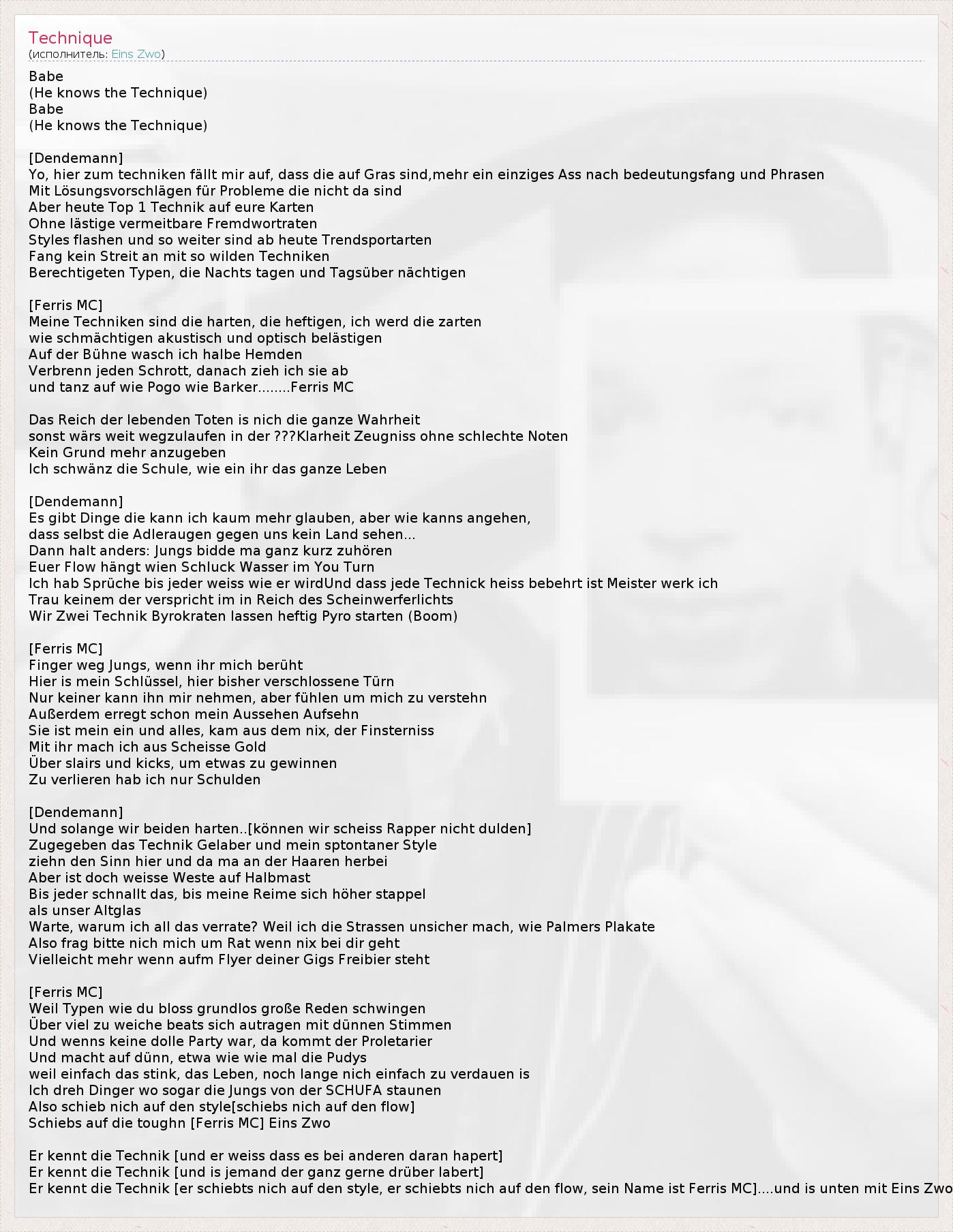 Babe (He knows the Technique) Babe (He knows the Technique) [Dendemann] Yo, hier zum techniken fällt mir auf, dass die auf Gras sind,mehr ein einziges Ass nach bedeutungsfang und Phrasen Mit Lösungsvorschlägen für Probleme die nicht da sind Aber heute Top 1 Technik auf eure Karten Ohne lästige vermeitbare Fremdwortraten Styles flashen und so weiter sind ab heute Trendsportarten Fang kein Streit an mit so wilden Techniken Berechtigeten Typen, die Nachts tagen und Tagsüber nächtigen [Ferris MC] Meine Techniken sind die harten, die heftigen, ich werd die zarten wie schmächtigen akustisch und optisch belästigen Auf der Bühne wasch ich halbe Hemden Verbrenn jeden Schrott, danach zieh ich sie ab und tanz auf wie Pogo wie Barker........Ferris MC Das Reich der lebenden Toten is nich die ganze Wahrheit sonst wärs weit wegzulaufen in der ???Klarheit Zeugniss ohne schlechte Noten Kein Grund mehr anzugeben Ich schwänz die Schule, wie ein ihr das ganze Leben [Dendemann] Es gibt Dinge die kann ich kaum mehr glauben, aber wie kanns angehen, dass selbst die Adleraugen gegen uns kein Land sehen... Dann halt anders: Jungs bidde ma ganz kurz zuhören Euer Flow hängt wien Schluck Wasser im You Turn Ich hab Sprüche bis jeder weiss wie er wirdUnd dass jede Technick heiss bebehrt ist Meister werk ich Trau keinem der verspricht im in Reich des Scheinwerferlichts Wir Zwei Technik Byrokraten lassen heftig Pyro starten (Boom) [Ferris MC] Finger weg Jungs, wenn ihr mich berüht Hier is mein Schlüssel, hier bisher verschlossene Türn Nur keiner kann ihn mir nehmen, aber fühlen um mich zu verstehn Außerdem erregt schon mein Aussehen Aufsehn Sie ist mein ein und alles, kam aus dem nix, der Finsterniss Mit ihr mach ich aus Scheisse Gold Über slairs und kicks, um etwas zu gewinnen Zu verlieren hab ich nur Schulden [Dendemann] Und solange wir beiden harten..[können wir scheiss Rapper nicht dulden] Zugegeben das Technik Gelaber und mein sptontaner Style ziehn den Sinn hier und da ma an der Haaren herbei Aber ist doch weisse Weste auf Halbmast Bis jeder schnallt das, bis meine Reime sich höher stappel als unser Altglas Warte, warum ich all das verrate? Weil ich die Strassen unsicher mach, wie Palmers Plakate Also frag bitte nich mich um Rat wenn nix bei dir geht Vielleicht mehr wenn aufm Flyer deiner Gigs Freibier steht [Ferris MC] Weil Typen wie du bloss grundlos große Reden schwingen Über viel zu weiche beats sich autragen mit dünnen Stimmen Und wenns keine dolle Party war, da kommt der Proletarier Und macht auf dünn, etwa wie wie mal die Pudys weil einfach das stink, das Leben, noch lange nich einfach zu verdauen is Ich dreh Dinger wo sogar die Jungs von der SCHUFA staunen Also schieb nich auf den style[schiebs nich auf den flow] Schiebs auf die toughn [Ferris MC] Eins Zwo Er kennt die Technik [und er weiss dass es bei anderen daran hapert] Er kennt die Technik [und is jemand der ganz gerne drüber labert] Er kennt die Technik [er schiebts nich auf den style, er schiebts nich auf den flow, sein Name ist Ferris MC]....und is unten mit Eins Zwo