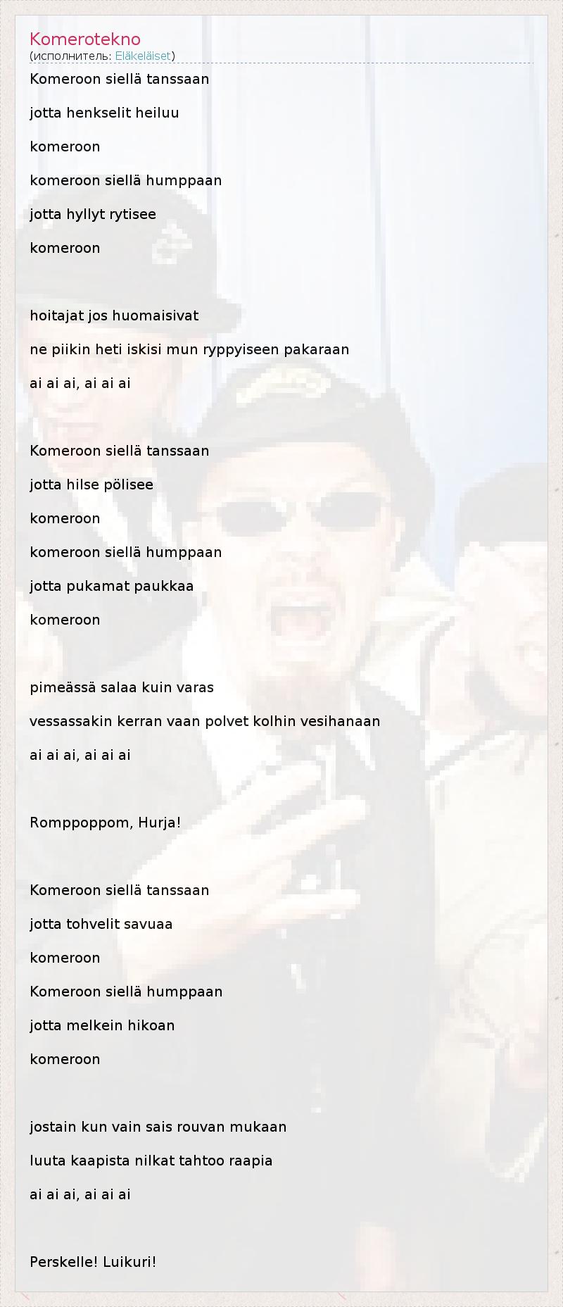 Это интересно:Eläkeläiset (фин. «Пенсионеры») — финский ансамбль, играющий музыку в стиле хумппа (финская разновидность быстрого фокстрота), преимущественно кавер-версии известных рок- и поп-хитов. Образовался в 1993 году. На протяжении существования ансамбля его состав претерпевал некоторые изменения, но наиболее постоянными участниками являются Онни Варис (клавишные, вокал), Матти Варис (бас-гитара,... продолжение