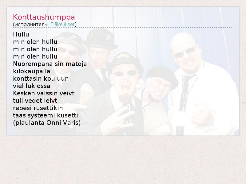 Это интересно:Eläkeläiset (фин. «Пенсионеры») — финский ансамбль, играющий музыку в стиле хумппа (финская разновидность быстрого фокстрота), преимущественно кавер-версии известных рок- и поп-хитов. Образовался в 1993 году. На протяжении существования ансамбля его состав претерпевал некоторые изменения, но наиболее постоянными участниками являются Онни Варис (клавишные, вокал), Матти Варис (бас-гитара,... продолжение