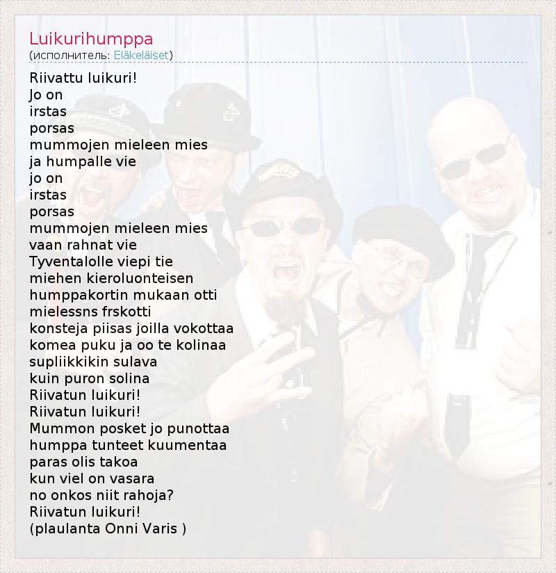 Riivattu luikuri! Jo on irstas porsas mummojen mieleen mies ja humpalle vie jo on irstas porsas mummojen mieleen mies vaan rahnat vie Tyventalolle viepi tie miehen kieroluonteisen humppakortin mukaan otti mielessns frskotti konsteja piisas joilla vokottaa komea puku ja oo te kolinaa supliikkikin sulava kuin puron solina Riivatun luikuri! Riivatun luikuri! Mummon posket jo punottaa humppa tunteet kuumentaa paras olis takoa kun viel on vasara no onkos niit rahoja? Riivatun luikuri! (plaulanta Onni Varis )