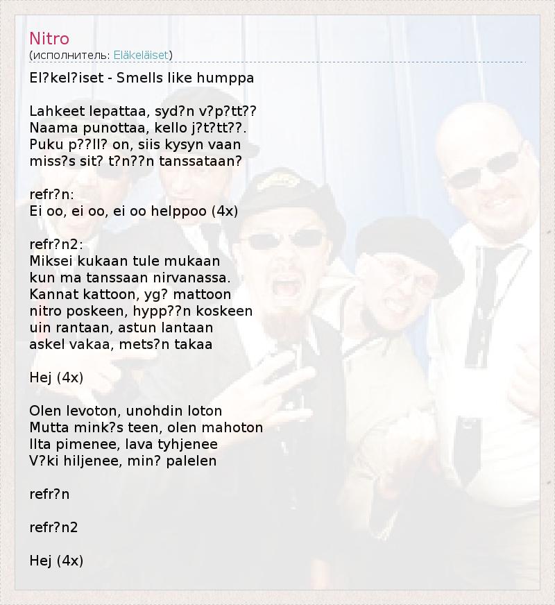 El?kel?iset - Smells like humppa Lahkeet lepattaa, syd?n v?p?tt?? Naama punottaa, kello j?t?tt??. Puku p??ll? on, siis kysyn vaan miss?s sit? t?n??n tanssataan? refr?n: Ei oo, ei oo, ei oo helppoo (4x) refr?n2: Miksei kukaan tule mukaan kun ma tanssaan nirvanassa. Kannat kattoon, yg? mattoon nitro poskeen, hypp??n koskeen uin rantaan, astun lantaan askel vakaa, mets?n takaa Hej (4x) Olen levoton, unohdin loton Mutta mink?s teen, olen mahoton Ilta pimenee, lava tyhjenee V?ki hiljenee, min? palelen refr?n refr?n2 Hej (4x)