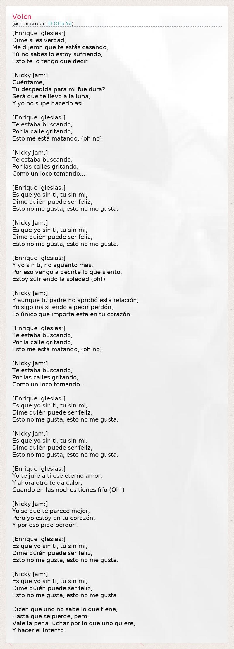 [Enrique Iglesias:] Dime si es verdad, Me dijeron que te estás casando, Tú no sabes lo estoy sufriendo, Esto te lo tengo que decir. [Nicky Jam:] Cuéntame, Tu despedida para mi fue dura? Será que te llevo a la luna, Y yo no supe hacerlo así. [Enrique Iglesias:] Te estaba buscando, Por la calle gritando, Esto me está matando, (oh no) [Nicky Jam:] Te estaba buscando, Por las calles gritando, Como un loco tomando... [Enrique Iglesias:] Es que yo sin ti, tu sin mi, Dime quién puede ser feliz, Esto no me gusta, esto no me gusta. [Nicky Jam:] Es que yo sin ti, tu sin mi, Dime quién puede ser feliz, Esto no me gusta, esto no me gusta. [Enrique Iglesias:] Y yo sin ti, no aguanto más, Por eso vengo a decirte lo que siento, Estoy sufriendo la soledad (oh!) [Nicky Jam:] Y aunque tu padre no aprobó esta relación, Yo sigo insistiendo a pedir perdón, Lo único que importa esta en tu corazón. [Enrique Iglesias:] Te estaba buscando, Por la calle gritando, Esto me está matando, (oh no) [Nicky Jam:] Te estaba buscando, Por las calles gritando, Como un loco tomando... [Enrique Iglesias:] Es que yo sin ti, tu sin mi, Dime quién puede ser feliz, Esto no me gusta, esto no me gusta. [Nicky Jam:] Es que yo sin ti, tu sin mi, Dime quién puede ser feliz, Esto no me gusta, esto no me gusta. [Enrique Iglesias:] Yo te jure a ti ese eterno amor, Y ahora otro te da calor, Cuando en las noches tienes frío (Oh!) [Nicky Jam:] Yo se que te parece mejor, Pero yo estoy en tu corazón, Y por eso pido perdón. [Enrique Iglesias:] Es que yo sin ti, tu sin mi, Dime quién puede ser feliz, Esto no me gusta, esto no me gusta. [Nicky Jam:] Es que yo sin ti, tu sin mi, Dime quién puede ser feliz, Esto no me gusta, esto no me gusta. Dicen que uno no sabe lo que tiene, Hasta que se pierde, pero.. Vale la pena luchar por lo que uno quiere, Y hacer el intento.