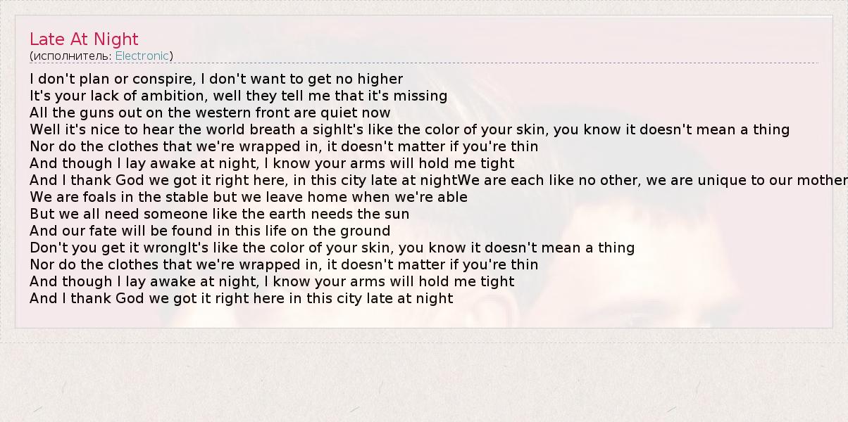 Это интересно:Electronic («Электро́ник») — британская группа, созданная Бернардом Самнером (New Order) и Джонни Марром (экс-Smiths). К участию в разное время также привлекались Нейл Теннант и Крис Лоу из Pet Shop Boys, Карл Бартос (Kraftwerk), Дональд Джонсон (A Certain Ratio) и Дэвид Палмер (ABC).В 1987 году Самнер и Джонни Марр из The Smiths стали писать песни для себя, отдельно от своих групп. Результатом стал проект Electronic, который сочетал... продолжение