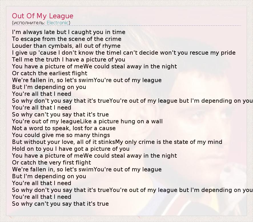 I'm always late but I caught you in time To escape from the scene of the crime Louder than cymbals, all out of rhyme I give up 'cause I don't know the timeI can't decide won't you rescue my pride Tell me the truth I have a picture of you You have a picture of meWe could steal away in the night Or catch the earliest flight We're fallen in, so let's swimYou're out of my league But I'm depending on you You're all that I need So why don't you say that it's trueYou're out of my league but I'm depending on you You're all that I need So why can't you say that it's true You're out of my leagueLike a picture hung on a wall Not a word to speak, lost for a cause You could give me so many things But without your love, all of it stinksMy only crime is the state of my mind Hold on to you I have got a picture of you You have a picture of meWe could steal away in the night Or catch the very first flight We're fallen in, so let's swimYou're out of my league But I'm depending on you You're all that I need So why don't you say that it's trueYou're out of my league but I'm depending on you You're all that I need So why can't you say that it's true
