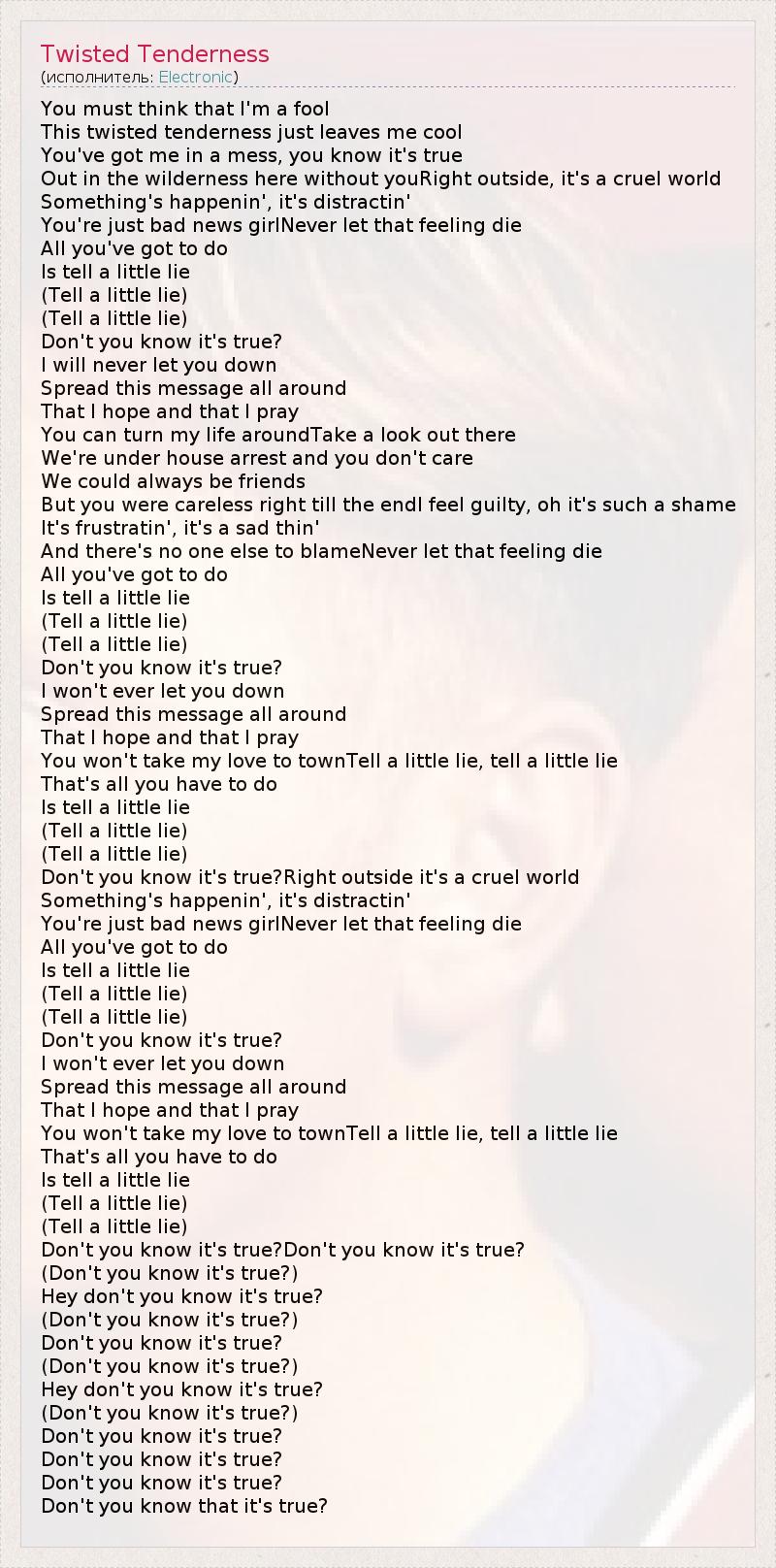 А как ты думаешь, о чем песня "Twisted Tenderness" ?