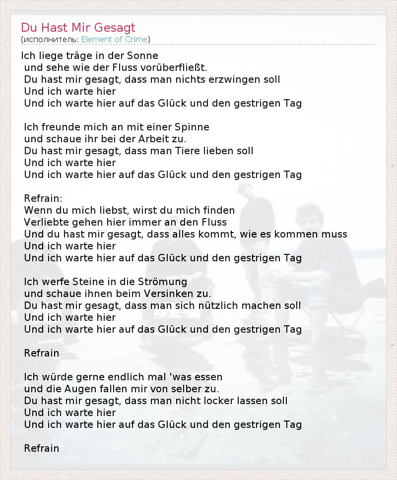 Ich Льеж träge в дер Sonne унд дер sehe Wie Фласс vorüberfließt. Ду Ты мир gesagt, Dass человек Nichts erzwingen SOLL Und Ich Warte Хайер Und Ich Warte Хир Ауф дас унд Глюк ден gestrigen тегов Ich Freunde Мичиган в MIT Einer Spinne унд schaue ММСП бай-дер Arbeit цу. Ду Ты мир gesagt, Dass человек Tiere Lieben Soll Und Ich Warte Хайер Und Ich Warte Хир Ауф дас унд Глюк ден gestrigen тегов Припев: Венна дю Мичиган Liebst, Wirst дю Мичиган Финден Verliebte gehen Хир Immer ден Фласс Und дю Ты мир gesagt, Dass Alles Kommt, Wie эс kommen беспорядок Und Ich Warte Хайер Und Ich Warte Хир Ауф дас унд Глюк ден gestrigen тегов Ich werfe Стейн в штампа Strömung унд schaue Ihnen байм Versinken цу. Ду Ты мир gesagt, Dass человек Сич Полезное Machen Soll Und Ich Warte Хайер Und Ich Warte Хир Ауф дас унд Глюк ден gestrigen тегов Воздерживаться Ich würde Gerne Endlich мал »был Эссен унд умереть Augen упал мир фон Selber Зу. Ду Ты мир gesagt, Dass человек Nicht шкафчик Лассен Soll Und Ich Warte Хайер Und Ich Warte Хир Ауф дас унд Глюк ден gestrigen тегов Воздерживаться