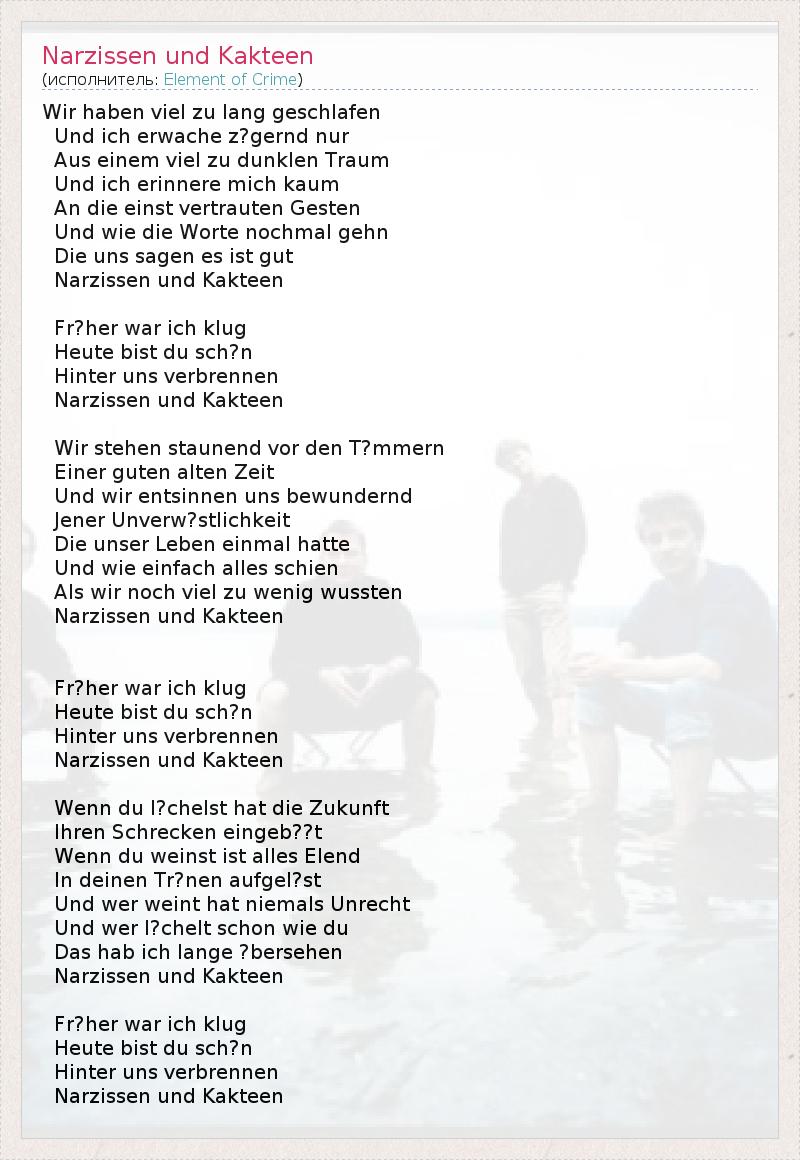Wir haben viel zu lang geschlafen Und ich erwache z?gernd nur Aus einem viel zu dunklen Traum Und ich erinnere mich kaum An die einst vertrauten Gesten Und wie die Worte nochmal gehn Die uns sagen es ist gut Narzissen und Kakteen Fr?her war ich klug Heute bist du sch?n Hinter uns verbrennen Narzissen und Kakteen Wir stehen staunend vor den T?mmern Einer guten alten Zeit Und wir entsinnen uns bewundernd Jener Unverw?stlichkeit Die unser Leben einmal hatte Und wie einfach alles schien Als wir noch viel zu wenig wussten Narzissen und Kakteen Fr?her war ich klug Heute bist du sch?n Hinter uns verbrennen Narzissen und Kakteen Wenn du l?chelst hat die Zukunft Ihren Schrecken eingeb??t Wenn du weinst ist alles Elend In deinen Tr?nen aufgel?st Und wer weint hat niemals Unrecht Und wer l?chelt schon wie du Das hab ich lange ?bersehen Narzissen und Kakteen Fr?her war ich klug Heute bist du sch?n Hinter uns verbrennen Narzissen und Kakteen