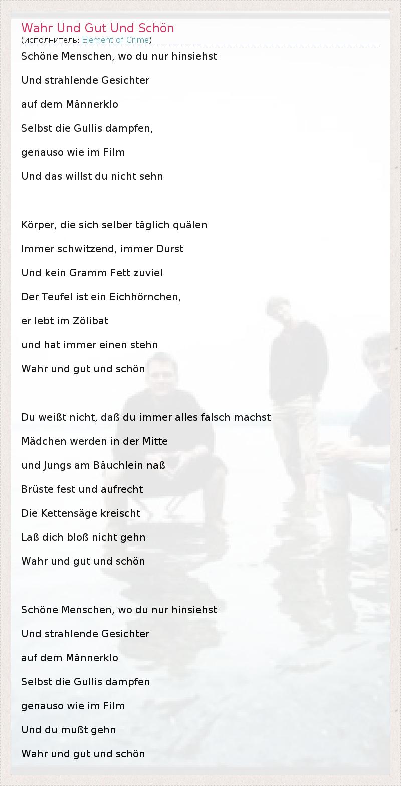 Schöne Menschen, wo du nur hinsiehst Und strahlende Gesichter auf dem Männerklo Selbst die Gullis dampfen, genauso wie im Film Und das willst du nicht sehn Körper, die sich selber täglich quälen Immer schwitzend, immer Durst Und kein Gramm Fett zuviel Der Teufel ist ein Eichhörnchen, er lebt im Zölibat und hat immer einen stehn Wahr und gut und schön Du weißt nicht, daß du immer alles falsch machst Mädchen werden in der Mitte und Jungs am Bäuchlein naß Brüste fest und aufrecht Die Kettensäge kreischt Laß dich bloß nicht gehn Wahr und gut und schön Schöne Menschen, wo du nur hinsiehst Und strahlende Gesichter auf dem Männerklo Selbst die Gullis dampfen genauso wie im Film Und du mußt gehn Wahr und gut und schön