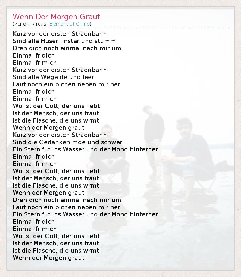 Kurz vor der ersten Straenbahn Sind alle Huser finster und stumm Dreh dich noch einmal nach mir um Einmal fr dich Einmal fr mich Kurz vor der ersten Straenbahn Sind alle Wege de und leer Lauf noch ein bichen neben mir her Einmal fr dich Einmal fr mich Wo ist der Gott, der uns liebt Ist der Mensch, der uns traut Ist die Flasche, die uns wrmt Wenn der Morgen graut Kurz vor der ersten Straenbahn Sind die Gedanken mde und schwer Ein Stern fllt ins Wasser und der Mond hinterher Einmal fr dich Einmal fr mich Wo ist der Gott, der uns liebt Ist der Mensch, der uns traut Ist die Flasche, die uns wrmt Wenn der Morgen graut Dreh dich noch einmal nach mir um Lauf noch ein bichen neben mir her Ein Stern fllt ins Wasser und der Mond hinterher Einmal fr dich Einmal fr mich Wo ist der Gott, der uns liebt Ist der Mensch, der uns traut Ist die Flasche, die uns wrmt Wenn der Morgen graut