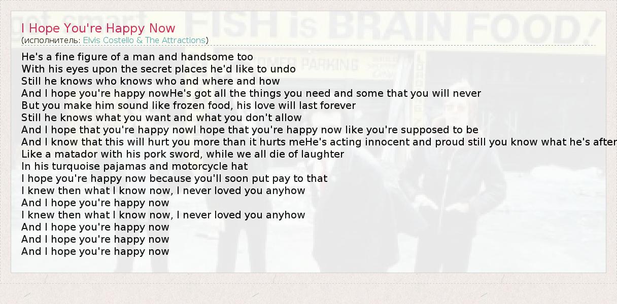 He's a fine figure of a man and handsome too With his eyes upon the secret places he'd like to undo Still he knows who knows who and where and how And I hope you're happy nowHe's got all the things you need and some that you will never But you make him sound like frozen food, his love will last forever Still he knows what you want and what you don't allow And I hope that you're happy nowI hope that you're happy now like you're supposed to be And I know that this will hurt you more than it hurts meHe's acting innocent and proud still you know what he's after Like a matador with his pork sword, while we all die of laughter In his turquoise pajamas and motorcycle hat I hope you're happy now because you'll soon put pay to that I knew then what I know now, I never loved you anyhow And I hope you're happy now I knew then what I know now, I never loved you anyhow And I hope you're happy now And I hope you're happy now And I hope you're happy now