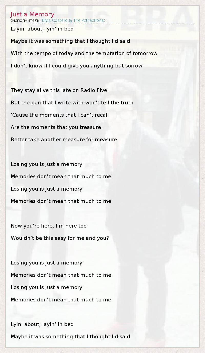 Layin' about, lyin' in bed Maybe it was something that I thought I'd said With the tempo of today and the temptation of tomorrow I don't know if I could give you anything but sorrow They stay alive this late on Radio Five But the pen that I write with won't tell the truth 'Cause the moments that I can't recall Are the moments that you treasure Better take another measure for measure Losing you is just a memory Memories don't mean that much to me Losing you is just a memory Memories don't mean that much to me Now you're here, I'm here too Wouldn't be this easy for me and you? Losing you is just a memory Memories don't mean that much to me Losing you is just a memory Memories don't mean that much to me Lyin' about, layin' in bed Maybe it was something that I thought I'd said