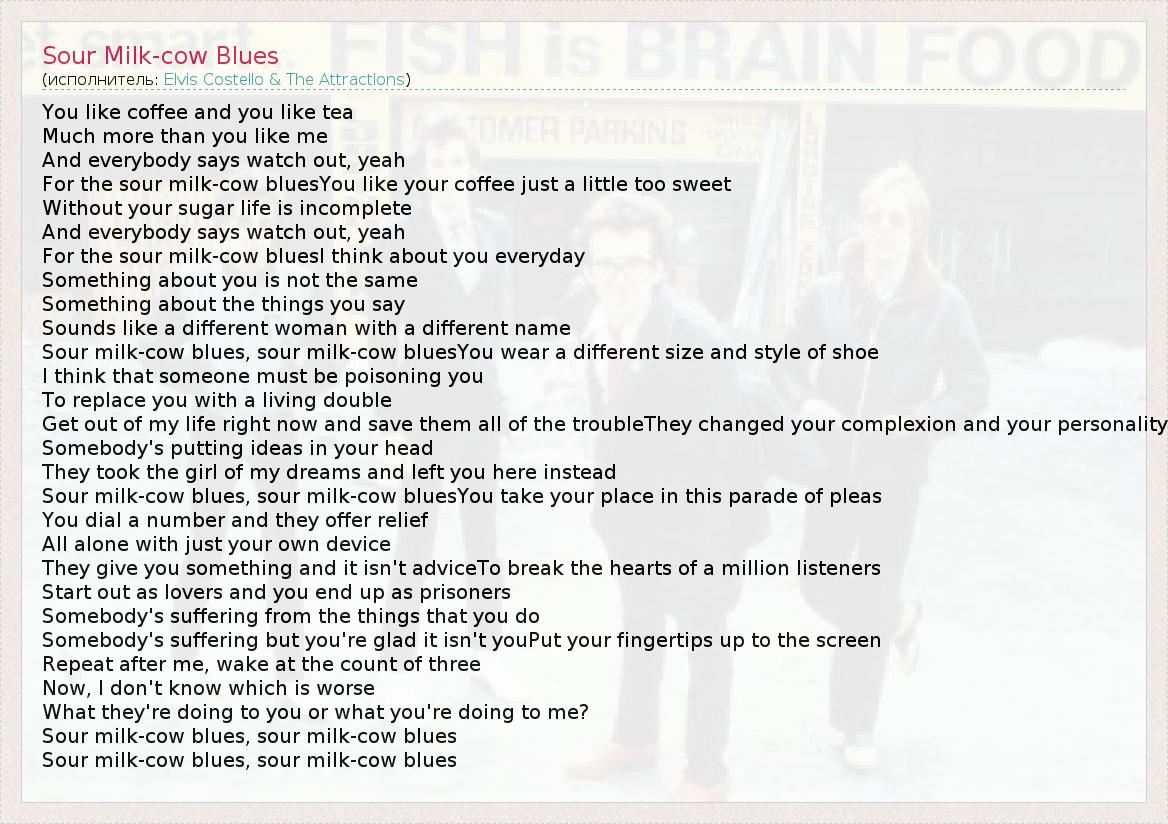 You like coffee and you like tea Much more than you like me And everybody says watch out, yeah For the sour milk-cow bluesYou like your coffee just a little too sweet Without your sugar life is incomplete And everybody says watch out, yeah For the sour milk-cow bluesI think about you everyday Something about you is not the same Something about the things you say Sounds like a different woman with a different name Sour milk-cow blues, sour milk-cow bluesYou wear a different size and style of shoe I think that someone must be poisoning you To replace you with a living double Get out of my life right now and save them all of the troubleThey changed your complexion and your personality Somebody's putting ideas in your head They took the girl of my dreams and left you here instead Sour milk-cow blues, sour milk-cow bluesYou take your place in this parade of pleas You dial a number and they offer relief All alone with just your own device They give you something and it isn't adviceTo break the hearts of a million listeners Start out as lovers and you end up as prisoners Somebody's suffering from the things that you do Somebody's suffering but you're glad it isn't youPut your fingertips up to the screen Repeat after me, wake at the count of three Now, I don't know which is worse What they're doing to you or what you're doing to me? Sour milk-cow blues, sour milk-cow blues Sour milk-cow blues, sour milk-cow blues