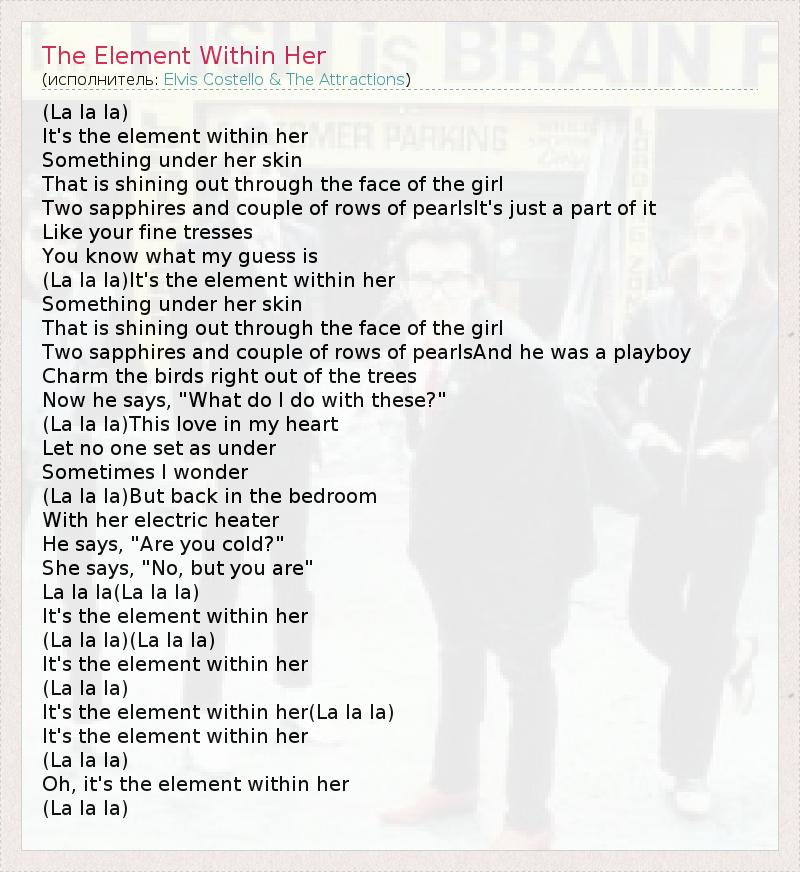 (La la la) It's the element within her Something under her skin That is shining out through the face of the girl Two sapphires and couple of rows of pearlsIt's just a part of it Like your fine tresses You know what my guess is (La la la)It's the element within her Something under her skin That is shining out through the face of the girl Two sapphires and couple of rows of pearlsAnd he was a playboy Charm the birds right out of the trees Now he says, "What do I do with these?" (La la la)This love in my heart Let no one set as under Sometimes I wonder (La la la)But back in the bedroom With her electric heater He says, "Are you cold?" She says, "No, but you are" La la la(La la la) It's the element within her (La la la)(La la la) It's the element within her (La la la) It's the element within her(La la la) It's the element within her (La la la) Oh, it's the element within her (La la la)