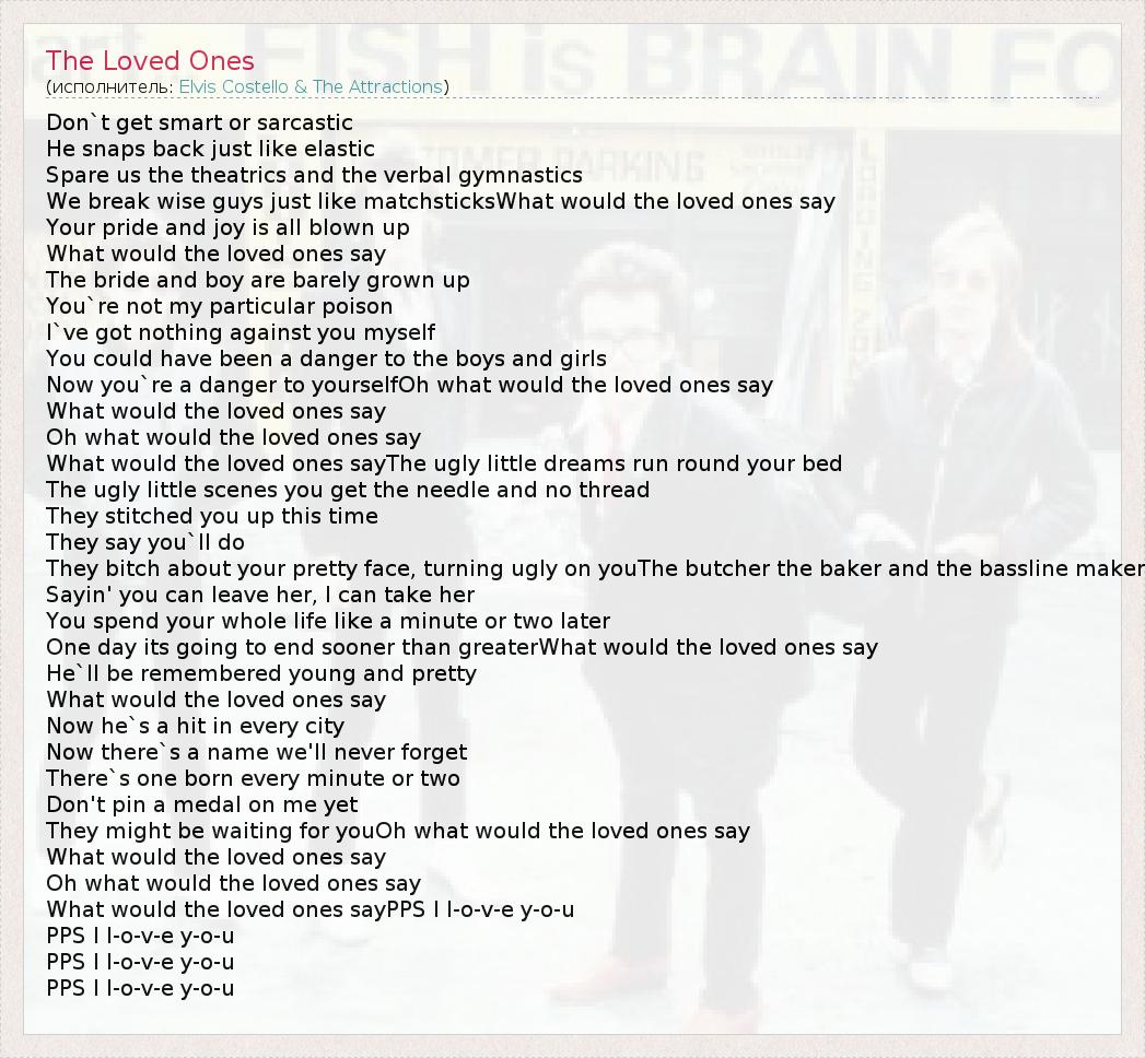 Don`t get smart or sarcastic He snaps back just like elastic Spare us the theatrics and the verbal gymnastics We break wise guys just like matchsticksWhat would the loved ones say Your pride and joy is all blown up What would the loved ones say The bride and boy are barely grown up You`re not my particular poison I`ve got nothing against you myself You could have been a danger to the boys and girls Now you`re a danger to yourselfOh what would the loved ones say What would the loved ones say Oh what would the loved ones say What would the loved ones sayThe ugly little dreams run round your bed The ugly little scenes you get the needle and no thread They stitched you up this time They say you`ll do They bitch about your pretty face, turning ugly on youThe butcher the baker and the bassline maker Sayin' you can leave her, I can take her You spend your whole life like a minute or two later One day its going to end sooner than greaterWhat would the loved ones say He`ll be remembered young and pretty What would the loved ones say Now he`s a hit in every city Now there`s a name we'll never forget There`s one born every minute or two Don't pin a medal on me yet They might be waiting for youOh what would the loved ones say What would the loved ones say Oh what would the loved ones say What would the loved ones sayPPS I l-o-v-e y-o-u PPS I l-o-v-e y-o-u PPS I l-o-v-e y-o-u PPS I l-o-v-e y-o-u