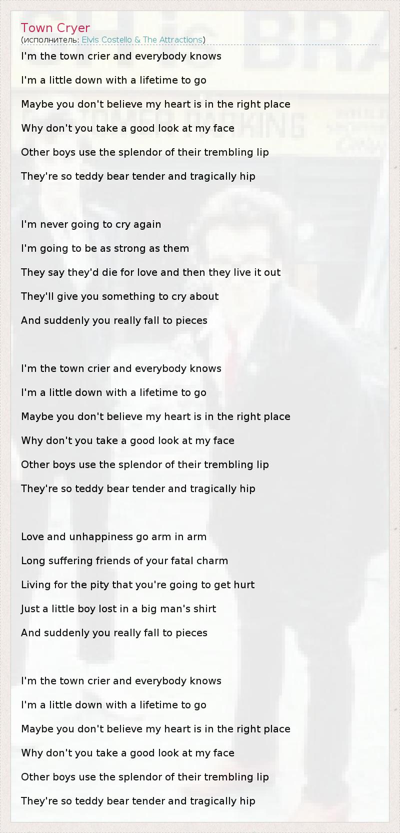 I'm the town crier and everybody knows I'm a little down with a lifetime to go Maybe you don't believe my heart is in the right place Why don't you take a good look at my face Other boys use the splendor of their trembling lip They're so teddy bear tender and tragically hip I'm never going to cry again I'm going to be as strong as them They say they'd die for love and then they live it out They'll give you something to cry about And suddenly you really fall to pieces I'm the town crier and everybody knows I'm a little down with a lifetime to go Maybe you don't believe my heart is in the right place Why don't you take a good look at my face Other boys use the splendor of their trembling lip They're so teddy bear tender and tragically hip Love and unhappiness go arm in arm Long suffering friends of your fatal charm Living for the pity that you're going to get hurt Just a little boy lost in a big man's shirt And suddenly you really fall to pieces I'm the town crier and everybody knows I'm a little down with a lifetime to go Maybe you don't believe my heart is in the right place Why don't you take a good look at my face Other boys use the splendor of their trembling lip They're so teddy bear tender and tragically hip