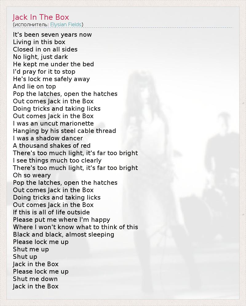 It's been seven years now Living in this box Closed in on all sides No light, just dark He kept me under the bed I'd pray for it to stop He's lock me safely away And lie on top Pop the latches, open the hatches Out comes Jack in the Box Doing tricks and taking licks Out comes Jack in the Box I was an uncut marionette Hanging by his steel cable thread I was a shadow dancer A thousand shakes of red There's too much light, it's far too bright I see things much too clearly There's too much light, it's far too bright Oh so weary Pop the latches, open the hatches Out comes Jack in the Box Doing tricks and taking licks Out comes Jack in the Box If this is all of life outside Please put me where I'm happy Where I won't know what to think of this Black and black, almost sleeping Please lock me up Shut me up Shut up Jack in the Box Please lock me up Shut me down Jack in the Box