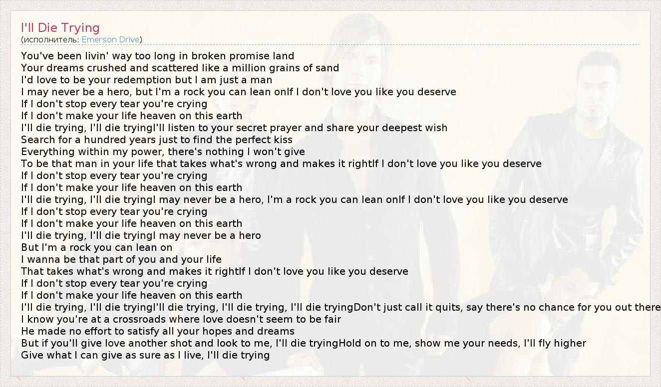 You've been livin' way too long in broken promise land Your dreams crushed and scattered like a million grains of sand I'd love to be your redemption but I am just a man I may never be a hero, but I'm a rock you can lean onIf I don't love you like you deserve If I don't stop every tear you're crying If I don't make your life heaven on this earth I'll die trying, I'll die tryingI'll listen to your secret prayer and share your deepest wish Search for a hundred years just to find the perfect kiss Everything within my power, there's nothing I won't give To be that man in your life that takes what's wrong and makes it rightIf I don't love you like you deserve If I don't stop every tear you're crying If I don't make your life heaven on this earth I'll die trying, I'll die tryingI may never be a hero, I'm a rock you can lean onIf I don't love you like you deserve If I don't stop every tear you're crying If I don't make your life heaven on this earth I'll die trying, I'll die tryingI may never be a hero But I'm a rock you can lean on I wanna be that part of you and your life That takes what's wrong and makes it rightIf I don't love you like you deserve If I don't stop every tear you're crying If I don't make your life heaven on this earth I'll die trying, I'll die tryingI'll die trying, I'll die trying, I'll die tryingDon't just call it quits, say there's no chance for you out there I know you're at a crossroads where love doesn't seem to be fair He made no effort to satisfy all your hopes and dreams But if you'll give love another shot and look to me, I'll die tryingHold on to me, show me your needs, I'll fly higher Give what I can give as sure as I live, I'll die trying