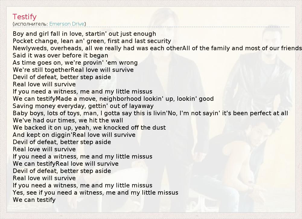 Boy and girl fall in love, startin' out just enough Pocket change, lean an' green, first and last security Newlyweds, overheads, all we really had was each otherAll of the family and most of our friends Said it was over before it began As time goes on, we're provin' 'em wrong We're still togetherReal love will survive Devil of defeat, better step aside Real love will survive If you need a witness, me and my little missus We can testifyMade a move, neighborhood lookin' up, lookin' good Saving money everyday, gettin' out of layaway Baby boys, lots of toys, man, I gotta say this is livin'No, I'm not sayin' it's been perfect at all We've had our times, we hit the wall We backed it on up, yeah, we knocked off the dust And kept on diggin'Real love will survive Devil of defeat, better step aside Real love will survive If you need a witness, me and my little missus We can testifyReal love will survive Devil of defeat, better step aside Real love will survive If you need a witness, me and my little missus Yes, see if you need a witness, me and my little missus We can testify