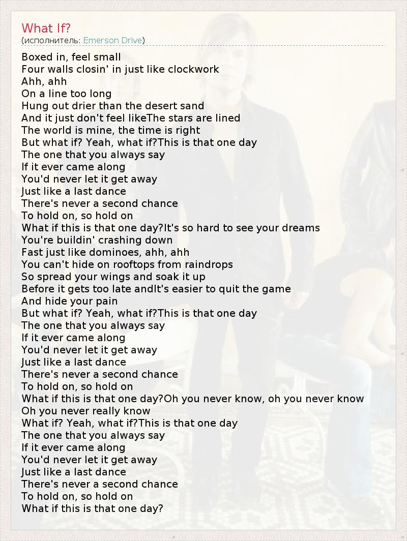 Boxed in, feel small Four walls closin' in just like clockwork Ahh, ahh On a line too long Hung out drier than the desert sand And it just don't feel likeThe stars are lined The world is mine, the time is right But what if? Yeah, what if?This is that one day The one that you always say If it ever came along You'd never let it get away Just like a last dance There's never a second chance To hold on, so hold on What if this is that one day?It's so hard to see your dreams You're buildin' crashing down Fast just like dominoes, ahh, ahh You can't hide on rooftops from raindrops So spread your wings and soak it up Before it gets too late andIt's easier to quit the game And hide your pain But what if? Yeah, what if?This is that one day The one that you always say If it ever came along You'd never let it get away Just like a last dance There's never a second chance To hold on, so hold on What if this is that one day?Oh you never know, oh you never know Oh you never really know What if? Yeah, what if?This is that one day The one that you always say If it ever came along You'd never let it get away Just like a last dance There's never a second chance To hold on, so hold on What if this is that one day?