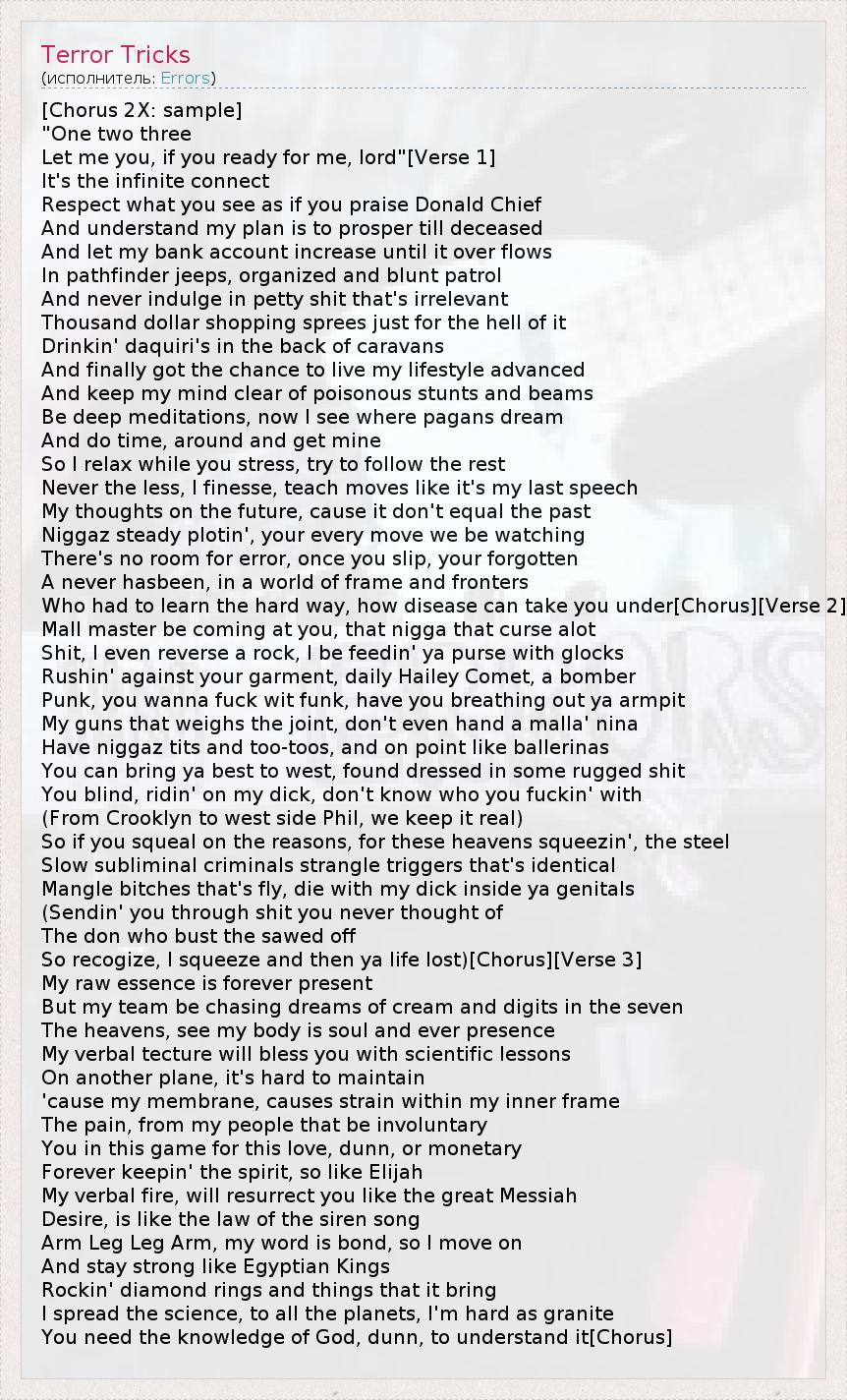 [Chorus 2X: sample] "One two three Let me you, if you ready for me, lord"[Verse 1] It's the infinite connect Respect what you see as if you praise Donald Chief And understand my plan is to prosper till deceased And let my bank account increase until it over flows In pathfinder jeeps, organized and blunt patrol And never indulge in petty shit that's irrelevant Thousand dollar shopping sprees just for the hell of it Drinkin' daquiri's in the back of caravans And finally got the chance to live my lifestyle advanced And keep my mind clear of poisonous stunts and beams Be deep meditations, now I see where pagans dream And do time, around and get mine So I relax while you stress, try to follow the rest Never the less, I finesse, teach moves like it's my last speech My thoughts on the future, cause it don't equal the past Niggaz steady plotin', your every move we be watching There's no room for error, once you slip, your forgotten A never hasbeen, in a world of frame and fronters Who had to learn the hard way, how disease can take you under[Chorus][Verse 2] Mall master be coming at you, that nigga that curse alot Shit, I even reverse a rock, I be feedin' ya purse with glocks Rushin' against your garment, daily Hailey Comet, a bomber Punk, you wanna fuck wit funk, have you breathing out ya armpit My guns that weighs the joint, don't even hand a malla' nina Have niggaz tits and too-toos, and on point like ballerinas You can bring ya best to west, found dressed in some rugged shit You blind, ridin' on my dick, don't know who you fuckin' with (From Crooklyn to west side Phil, we keep it real) So if you squeal on the reasons, for these heavens squeezin', the steel Slow subliminal criminals strangle triggers that's identical Mangle bitches that's fly, die with my dick inside ya genitals (Sendin' you through shit you never thought of The don who bust the sawed off So recogize, I squeeze and then ya life lost)[Chorus][Verse 3] My raw essence is forever present But my team be chasing dreams of cream and digits in the seven The heavens, see my body is soul and ever presence My verbal tecture will bless you with scientific lessons On another plane, it's hard to maintain 'cause my membrane, causes strain within my inner frame The pain, from my people that be involuntary You in this game for this love, dunn, or monetary Forever keepin' the spirit, so like Elijah My verbal fire, will resurrect you like the great Messiah Desire, is like the law of the siren song Arm Leg Leg Arm, my word is bond, so I move on And stay strong like Egyptian Kings Rockin' diamond rings and things that it bring I spread the science, to all the planets, I'm hard as granite You need the knowledge of God, dunn, to understand it[Chorus]