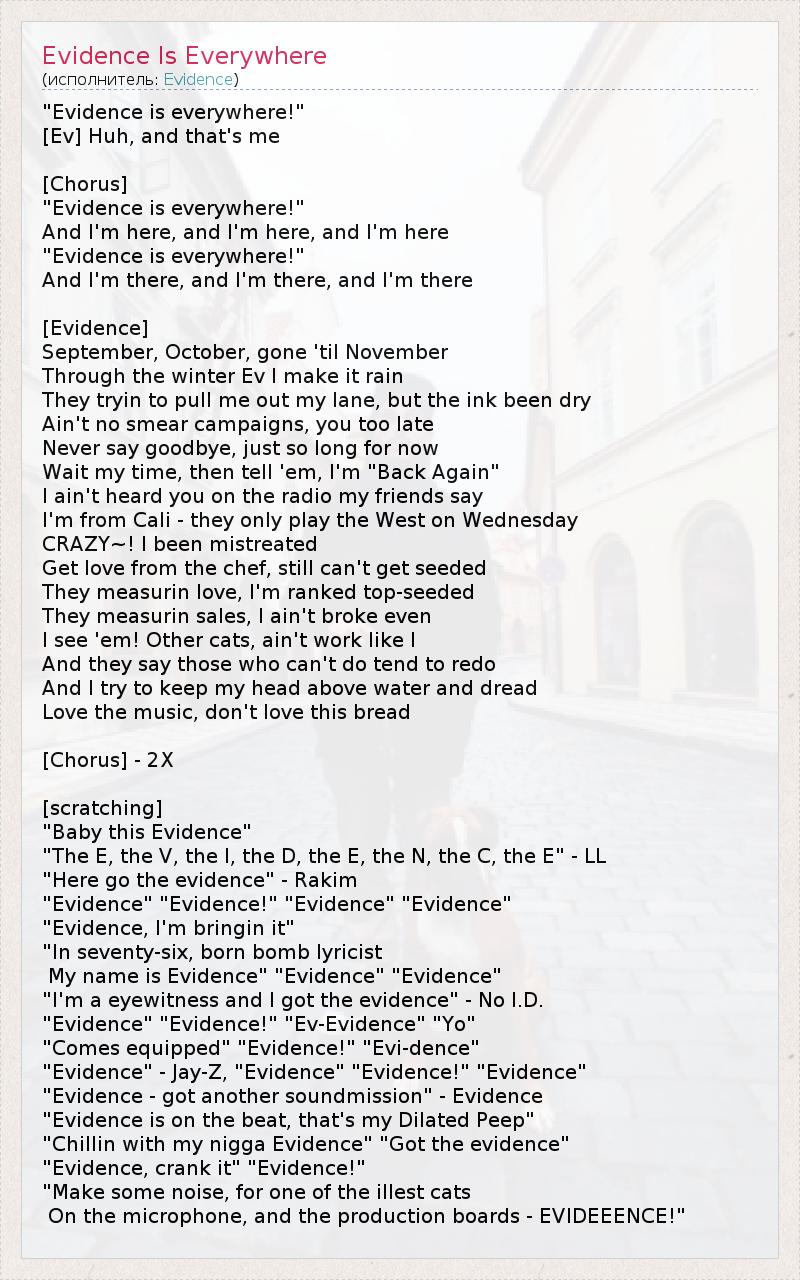 "Evidence is everywhere!" [Ev] Huh, and that's me [Chorus] "Evidence is everywhere!" And I'm here, and I'm here, and I'm here "Evidence is everywhere!" And I'm there, and I'm there, and I'm there [Evidence] September, October, gone 'til November Through the winter Ev I make it rain They tryin to pull me out my lane, but the ink been dry Ain't no smear campaigns, you too late Never say goodbye, just so long for now Wait my time, then tell 'em, I'm "Back Again" I ain't heard you on the radio my friends say I'm from Cali - they only play the West on Wednesday CRAZY~! I been mistreated Get love from the chef, still can't get seeded They measurin love, I'm ranked top-seeded They measurin sales, I ain't broke even I see 'em! Other cats, ain't work like I And they say those who can't do tend to redo And I try to keep my head above water and dread Love the music, don't love this bread [Chorus] - 2X [scratching] "Baby this Evidence" "The E, the V, the I, the D, the E, the N, the C, the E" - LL "Here go the evidence" - Rakim "Evidence" "Evidence!" "Evidence" "Evidence" "Evidence, I'm bringin it" "In seventy-six, born bomb lyricist My name is Evidence" "Evidence" "Evidence" "I'm a eyewitness and I got the evidence" - No I.D. "Evidence" "Evidence!" "Ev-Evidence" "Yo" "Comes equipped" "Evidence!" "Evi-dence" "Evidence" - Jay-Z, "Evidence" "Evidence!" "Evidence" "Evidence - got another soundmission" - Evidence "Evidence is on the beat, that's my Dilated Peep" "Chillin with my nigga Evidence" "Got the evidence" "Evidence, crank it" "Evidence!" "Make some noise, for one of the illest cats On the microphone, and the production boards - EVIDEEENCE!"