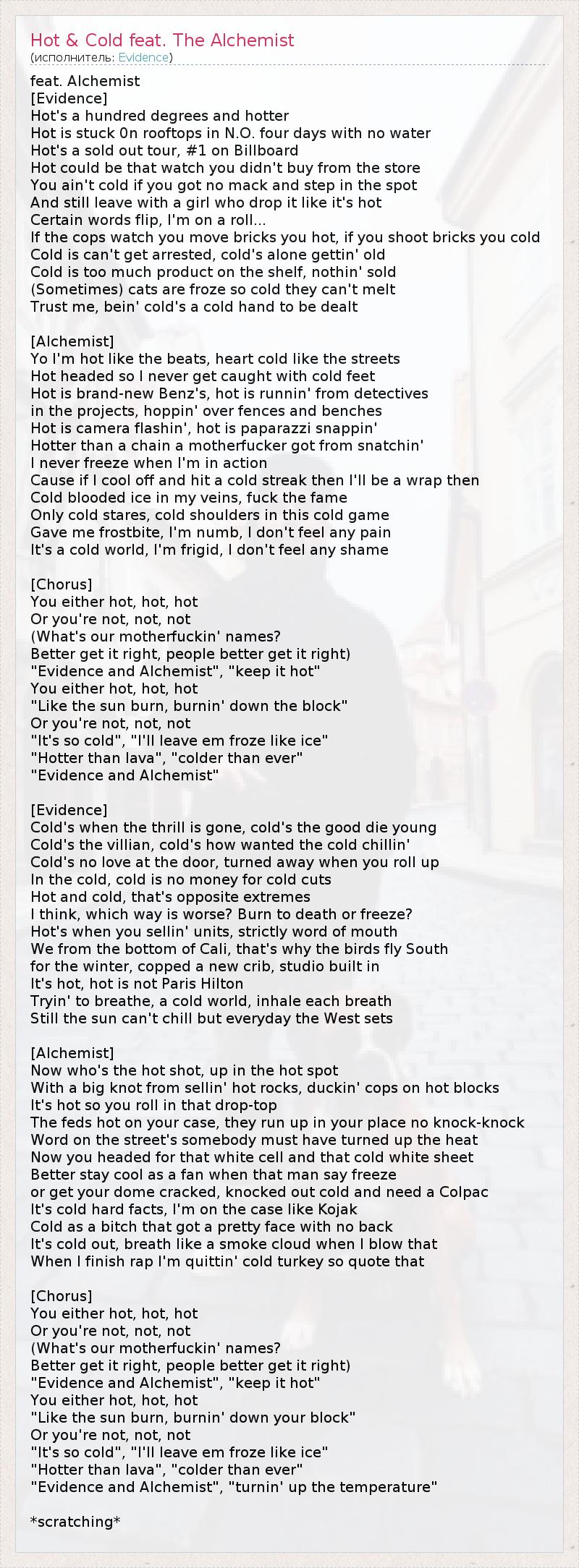 feat. Alchemist [Evidence] Hot's a hundred degrees and hotter Hot is stuck 0n rooftops in N.O. four days with no water Hot's a sold out tour, #1 on Billboard Hot could be that watch you didn't buy from the store You ain't cold if you got no mack and step in the spot And still leave with a girl who drop it like it's hot Certain words flip, I'm on a roll... If the cops watch you move bricks you hot, if you shoot bricks you cold Cold is can't get arrested, cold's alone gettin' old Cold is too much product on the shelf, nothin' sold (Sometimes) cats are froze so cold they can't melt Trust me, bein' cold's a cold hand to be dealt [Alchemist] Yo I'm hot like the beats, heart cold like the streets Hot headed so I never get caught with cold feet Hot is brand-new Benz's, hot is runnin' from detectives in the projects, hoppin' over fences and benches Hot is camera flashin', hot is paparazzi snappin' Hotter than a chain a motherfucker got from snatchin' I never freeze when I'm in action Cause if I cool off and hit a cold streak then I'll be a wrap then Cold blooded ice in my veins, fuck the fame Only cold stares, cold shoulders in this cold game Gave me frostbite, I'm numb, I don't feel any pain It's a cold world, I'm frigid, I don't feel any shame [Chorus] You either hot, hot, hot Or you're not, not, not (What's our motherfuckin' names? Better get it right, people better get it right) "Evidence and Alchemist", "keep it hot" You either hot, hot, hot "Like the sun burn, burnin' down the block" Or you're not, not, not "It's so cold", "I'll leave em froze like ice" "Hotter than lava", "colder than ever" "Evidence and Alchemist" [Evidence] Cold's when the thrill is gone, cold's the good die young Cold's the villian, cold's how wanted the cold chillin' Cold's no love at the door, turned away when you roll up In the cold, cold is no money for cold cuts Hot and cold, that's opposite extremes I think, which way is worse? Burn to death or freeze? Hot's when you sellin' units, strictly word of mouth We from the bottom of Cali, that's why the birds fly South for the winter, copped a new crib, studio built in It's hot, hot is not Paris Hilton Tryin' to breathe, a cold world, inhale each breath Still the sun can't chill but everyday the West sets [Alchemist] Now who's the hot shot, up in the hot spot With a big knot from sellin' hot rocks, duckin' cops on hot blocks It's hot so you roll in that drop-top The feds hot on your case, they run up in your place no knock-knock Word on the street's somebody must have turned up the heat Now you headed for that white cell and that cold white sheet Better stay cool as a fan when that man say freeze or get your dome cracked, knocked out cold and need a Colpac It's cold hard facts, I'm on the case like Kojak Cold as a bitch that got a pretty face with no back It's cold out, breath like a smoke cloud when I blow that When I finish rap I'm quittin' cold turkey so quote that [Chorus] You either hot, hot, hot Or you're not, not, not (What's our motherfuckin' names? Better get it right, people better get it right) "Evidence and Alchemist", "keep it hot" You either hot, hot, hot "Like the sun burn, burnin' down your block" Or you're not, not, not "It's so cold", "I'll leave em froze like ice" "Hotter than lava", "colder than ever" "Evidence and Alchemist", "turnin' up the temperature" *scratching*