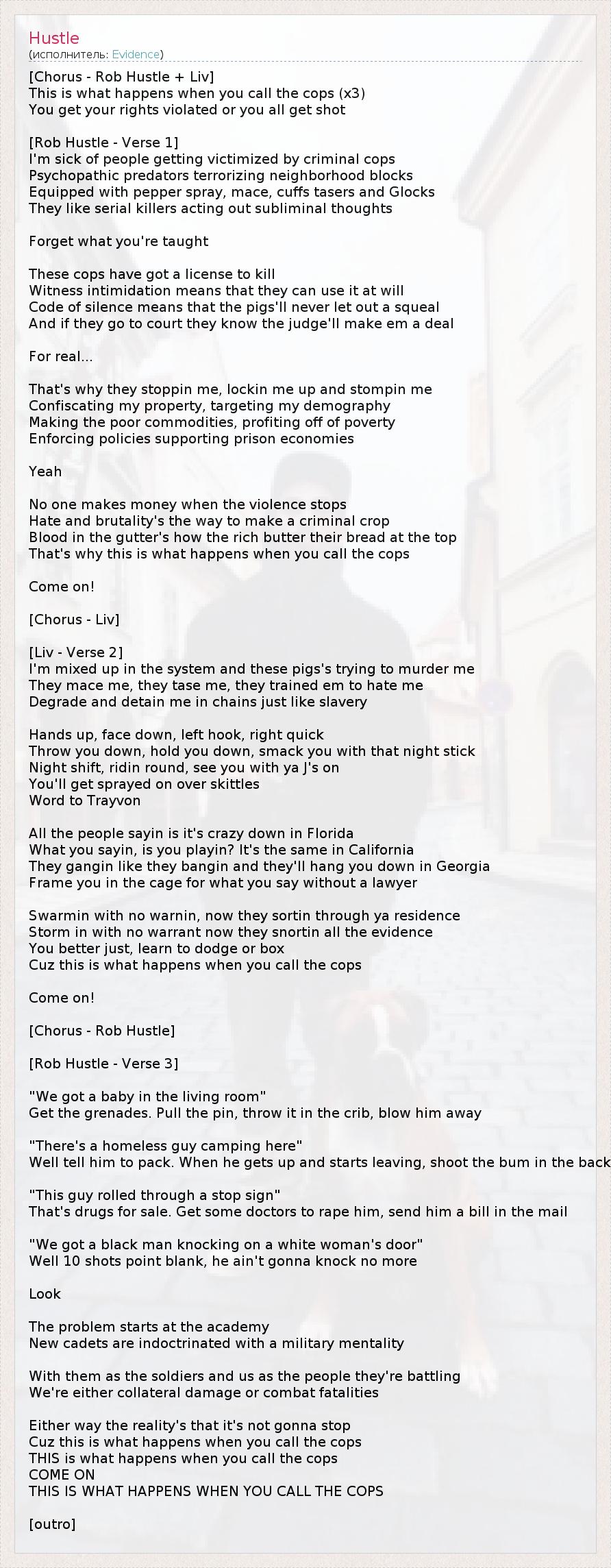 [Chorus - Rob Hustle + Liv] This is what happens when you call the cops (x3) You get your rights violated or you all get shot [Rob Hustle - Verse 1] I'm sick of people getting victimized by criminal cops Psychopathic predators terrorizing neighborhood blocks Equipped with pepper spray, mace, cuffs tasers and Glocks They like serial killers acting out subliminal thoughts Forget what you're taught These cops have got a license to kill Witness intimidation means that they can use it at will Code of silence means that the pigs'll never let out a squeal And if they go to court they know the judge'll make em a deal For real... That's why they stoppin me, lockin me up and stompin me Confiscating my property, targeting my demography Making the poor commodities, profiting off of poverty Enforcing policies supporting prison economies Yeah No one makes money when the violence stops Hate and brutality's the way to make a criminal crop Blood in the gutter's how the rich butter their bread at the top That's why this is what happens when you call the cops Come on! [Chorus - Liv] [Liv - Verse 2] I'm mixed up in the system and these pigs's trying to murder me They mace me, they tase me, they trained em to hate me Degrade and detain me in chains just like slavery Hands up, face down, left hook, right quick Throw you down, hold you down, smack you with that night stick Night shift, ridin round, see you with ya J's on You'll get sprayed on over skittles Word to Trayvon All the people sayin is it's crazy down in Florida What you sayin, is you playin? It's the same in California They gangin like they bangin and they'll hang you down in Georgia Frame you in the cage for what you say without a lawyer Swarmin with no warnin, now they sortin through ya residence Storm in with no warrant now they snortin all the evidence You better just, learn to dodge or box Cuz this is what happens when you call the cops Come on! [Chorus - Rob Hustle] [Rob Hustle - Verse 3] "We got a baby in the living room" Get the grenades. Pull the pin, throw it in the crib, blow him away "There's a homeless guy camping here" Well tell him to pack. When he gets up and starts leaving, shoot the bum in the back "This guy rolled through a stop sign" That's drugs for sale. Get some doctors to rape him, send him a bill in the mail "We got a black man knocking on a white woman's door" Well 10 shots point blank, he ain't gonna knock no more Look The problem starts at the academy New cadets are indoctrinated with a military mentality With them as the soldiers and us as the people they're battling We're either collateral damage or combat fatalities Either way the reality's that it's not gonna stop Cuz this is what happens when you call the cops THIS is what happens when you call the cops COME ON THIS IS WHAT HAPPENS WHEN YOU CALL THE COPS [outro]