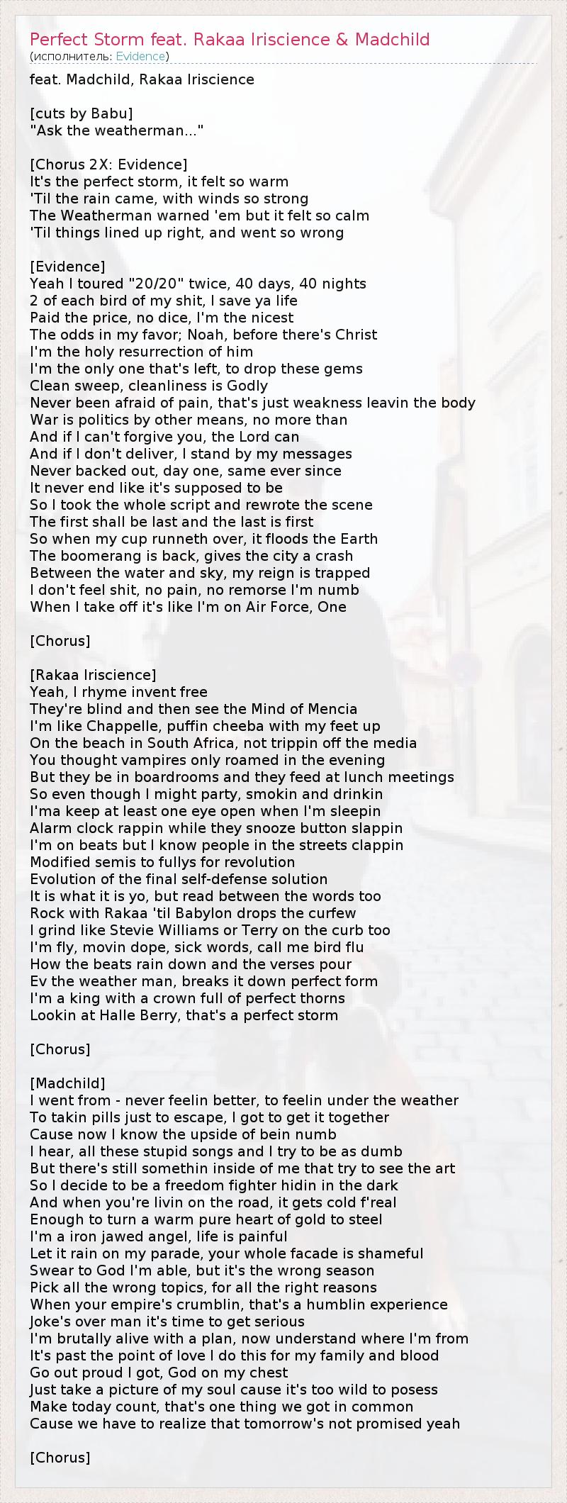 feat. Madchild, Rakaa Iriscience [cuts by Babu] "Ask the weatherman..." [Chorus 2X: Evidence] It's the perfect storm, it felt so warm 'Til the rain came, with winds so strong The Weatherman warned 'em but it felt so calm 'Til things lined up right, and went so wrong [Evidence] Yeah I toured "20/20" twice, 40 days, 40 nights 2 of each bird of my shit, I save ya life Paid the price, no dice, I'm the nicest The odds in my favor; Noah, before there's Christ I'm the holy resurrection of him I'm the only one that's left, to drop these gems Clean sweep, cleanliness is Godly Never been afraid of pain, that's just weakness leavin the body War is politics by other means, no more than And if I can't forgive you, the Lord can And if I don't deliver, I stand by my messages Never backed out, day one, same ever since It never end like it's supposed to be So I took the whole script and rewrote the scene The first shall be last and the last is first So when my cup runneth over, it floods the Earth The boomerang is back, gives the city a crash Between the water and sky, my reign is trapped I don't feel shit, no pain, no remorse I'm numb When I take off it's like I'm on Air Force, One [Chorus] [Rakaa Iriscience] Yeah, I rhyme invent free They're blind and then see the Mind of Mencia I'm like Chappelle, puffin cheeba with my feet up On the beach in South Africa, not trippin off the media You thought vampires only roamed in the evening But they be in boardrooms and they feed at lunch meetings So even though I might party, smokin and drinkin I'ma keep at least one eye open when I'm sleepin Alarm clock rappin while they snooze button slappin I'm on beats but I know people in the streets clappin Modified semis to fullys for revolution Evolution of the final self-defense solution It is what it is yo, but read between the words too Rock with Rakaa 'til Babylon drops the curfew I grind like Stevie Williams or Terry on the curb too I'm fly, movin dope, sick words, call me bird flu How the beats rain down and the verses pour Ev the weather man, breaks it down perfect form I'm a king with a crown full of perfect thorns Lookin at Halle Berry, that's a perfect storm [Chorus] [Madchild] I went from - never feelin better, to feelin under the weather To takin pills just to escape, I got to get it together Cause now I know the upside of bein numb I hear, all these stupid songs and I try to be as dumb But there's still somethin inside of me that try to see the art So I decide to be a freedom fighter hidin in the dark And when you're livin on the road, it gets cold f'real Enough to turn a warm pure heart of gold to steel I'm a iron jawed angel, life is painful Let it rain on my parade, your whole facade is shameful Swear to God I'm able, but it's the wrong season Pick all the wrong topics, for all the right reasons When your empire's crumblin, that's a humblin experience Joke's over man it's time to get serious I'm brutally alive with a plan, now understand where I'm from It's past the point of love I do this for my family and blood Go out proud I got, God on my chest Just take a picture of my soul cause it's too wild to posess Make today count, that's one thing we got in common Cause we have to realize that tomorrow's not promised yeah [Chorus]