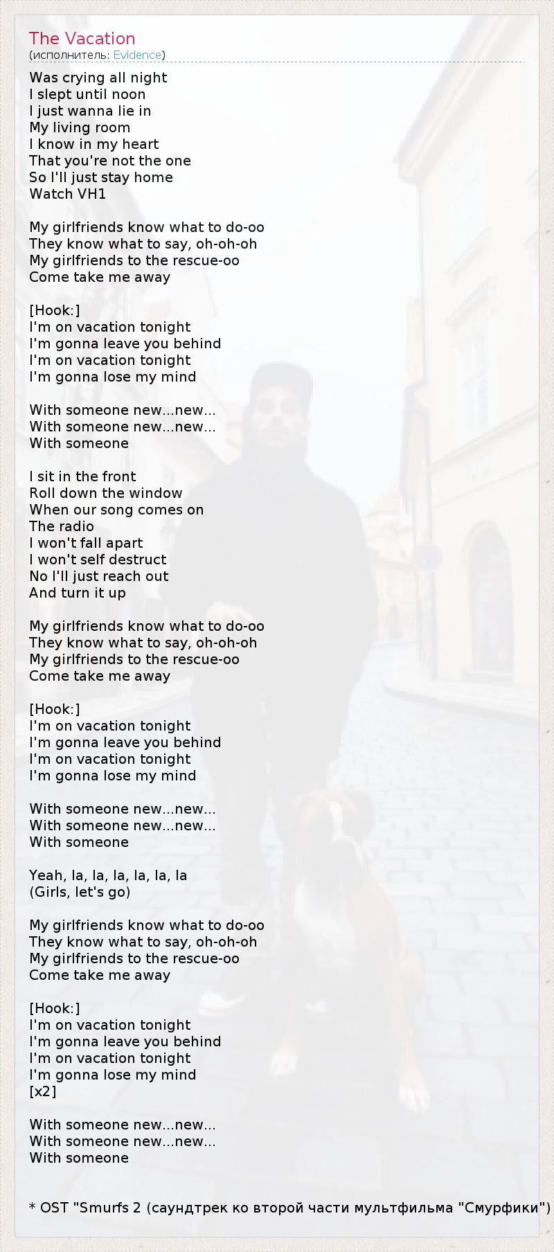Was crying all night I slept until noon I just wanna lie in My living room I know in my heart That you're not the one So I'll just stay home Watch VH1 My girlfriends know what to do-oo They know what to say, oh-oh-oh My girlfriends to the rescue-oo Come take me away [Hook:] I'm on vacation tonight I'm gonna leave you behind I'm on vacation tonight I'm gonna lose my mind With someone new...new... With someone new...new... With someone I sit in the front Roll down the window When our song comes on The radio I won't fall apart I won't self destruct No I'll just reach out And turn it up My girlfriends know what to do-oo They know what to say, oh-oh-oh My girlfriends to the rescue-oo Come take me away [Hook:] I'm on vacation tonight I'm gonna leave you behind I'm on vacation tonight I'm gonna lose my mind With someone new...new... With someone new...new... With someone Yeah, la, la, la, la, la, la (Girls, let's go) My girlfriends know what to do-oo They know what to say, oh-oh-oh My girlfriends to the rescue-oo Come take me away [Hook:] I'm on vacation tonight I'm gonna leave you behind I'm on vacation tonight I'm gonna lose my mind [x2] With someone new...new... With someone new...new... With someone * OST "Smurfs 2 (саундтрек ко второй части мультфильма "Смурфики")