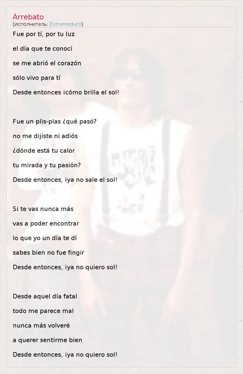Fue por tí, por tu luz el día que te conocí se me abrió el corazón sólo vivo para tí Desde entonces ¡cómo brilla el sol! Fue un plis-plas ¿qué pasó? no me dijiste ni adiós ¿dónde está tu calor tu mirada y tu pasión? Desde entonces, ¡ya no sale el sol! Si te vas nunca más vas a poder encontrar lo que yo un día te dí sabes bien no fue fingir Desde entonces, ¡ya no quiero sol! Desde aquel día fatal todo me parece mal nunca más volveré a querer sentirme bien Desde entonces, ¡ya no quiero sol!