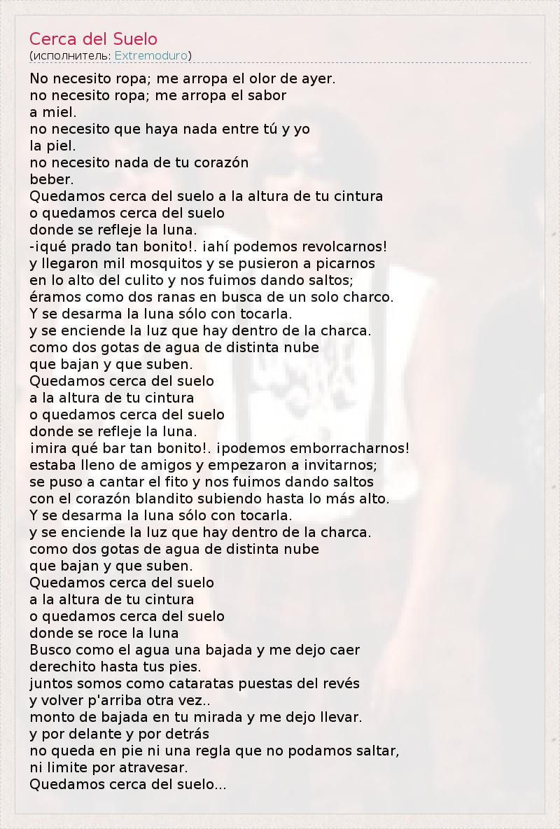 Нет Necesito Ропа ; мне arropa эль , гуси -де- Айер . нет Necesito Ропа ; мне arropa эль Сабора Миэль . нет Necesito Que хайа нада Entre tú у лет ла Piel . нет Necesito нада де Ту corazón Beber . Quedamos Cerca дель Sueloла Алтура де Ту Cintura О quedamos Cerca дель Suelo Donde себе refleje La Luna . -¡qué Prado загар скумбрия !. ¡ Ахи Podemos revolcarnos ! у llegaron млн комары у SE pusieronpicarnos ан вот альт -дель- culito у NOS fuimos Dando Saltos ; éramos Комо дос Рана EN Busca де ООН соло Charco . Y себе desarma La Luna sólo против tocarla . у SE enciende -ла-Лус Que сено Dentro -де-ла Charca . Комо дос GOTAS де-Агуа -де- distinta нубье Que Баян у Que SUBEN . Quedamos Cerca дель Suelo ла Алтура де Ту Cintura О quedamos Cerca дель Suelo Donde себе refleje La Luna . ¡ Миры Que бар загар скумбрия !. ¡ PODEMOS emborracharnos ! estaba lleno де Amigos у empezaron через invitarnos ; SE PusoCantar -эль- фито у NOS fuimos Dando Saltos кон -эль- Корасон blandito subiendo Hasta ло MAS -Альто. Y себе desarma La Luna sólo против tocarla . у SE enciende -ла-Лус Que сено Dentro -де-ла Charca . Комо дос GOTAS де-Агуа -де- distinta нубье Que Баян у Que SUBEN . Quedamos Cerca дель Suelo ла Алтура де Ту Cintura О quedamos Cerca дель Suelo Donde себе доход на инвестированный капитал La Luna Busco Комо Эль-Агуа Una Bajada у меня dejo Каэр derechito Hasta Тус пироги. Juntos Somos Комо Катаратас puestas дель Rêves у Volver p'arriba Otra Чавес .. Monto де Bajada ан Ту Mirada у меня dejo llevar . у POR delante у POR detrás Нет Каида EN пирог Ni Una Regla Que не podamos saltar , Ni -Лимите POR atravesar . Quedamos Cerca дель Suelo ...