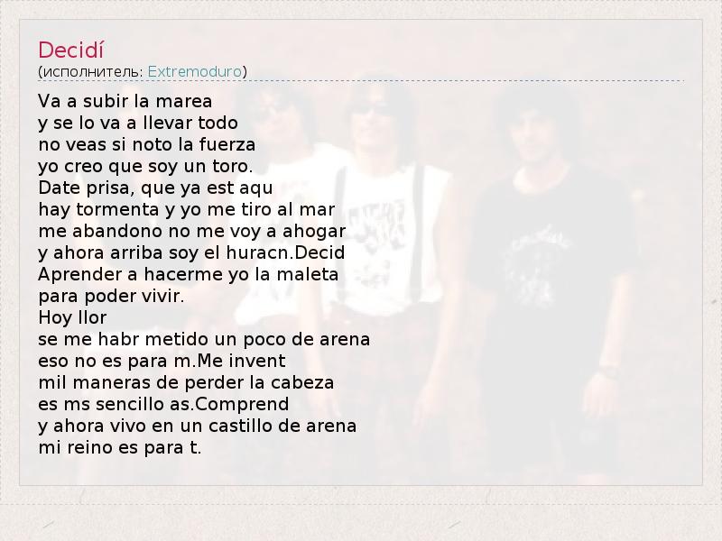 Это интересно:Extremoduro - испанская рок-группа из Пласенсии, Эстремадура. Лидера группы - Роберто Иньесту (Roberto Iniesta), также известного как "Robe", часто называют "El rey de Extremadura" - "Король Эстремадуры". Группа была создана в 1987-м году и считается одной из самых влиятельных команд в испанской хард-рок сцене, кроме того, она является настоящим символом своего региона. Лирику Роберто Иньесты часто... продолжение