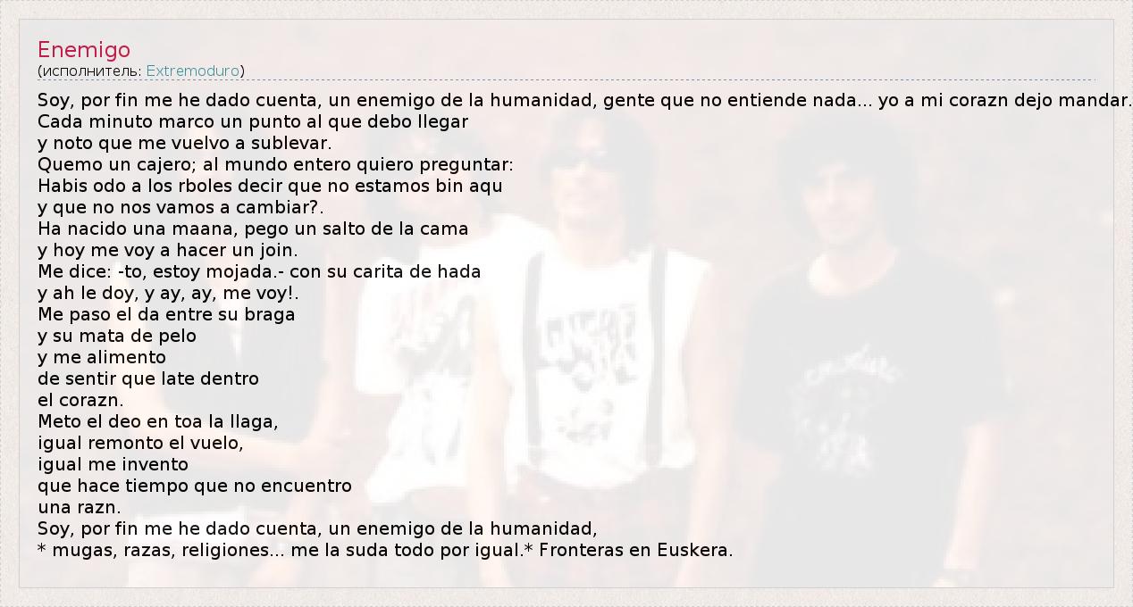 Soy, por fin me he dado cuenta, un enemigo de la humanidad, gente que no entiende nada... yo a mi corazn dejo mandar. Cada minuto marco un punto al que debo llegar y noto que me vuelvo a sublevar. Quemo un cajero; al mundo entero quiero preguntar: Habis odo a los rboles decir que no estamos bin aqu y que no nos vamos a cambiar?. Ha nacido una maana, pego un salto de la cama y hoy me voy a hacer un join. Me dice: -to, estoy mojada.- con su carita de hada y ah le doy, y ay, ay, me voy!. Me paso el da entre su braga y su mata de pelo y me alimento de sentir que late dentro el corazn. Meto el deo en toa la llaga, igual remonto el vuelo, igual me invento que hace tiempo que no encuentro una razn. Soy, por fin me he dado cuenta, un enemigo de la humanidad, * mugas, razas, religiones... me la suda todo por igual.* Fronteras en Euskera.