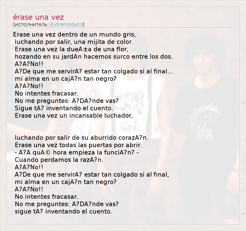 Это интересно:Extremoduro - испанская рок-группа из Пласенсии, Эстремадура. Лидера группы - Роберто Иньесту (Roberto Iniesta), также известного как "Robe", часто называют "El rey de Extremadura" - "Король Эстремадуры". Группа была создана в 1987-м году и считается одной из самых влиятельных команд в испанской хард-рок сцене, кроме того, она является настоящим символом своего региона. Лирику Роберто Иньесты часто... продолжение