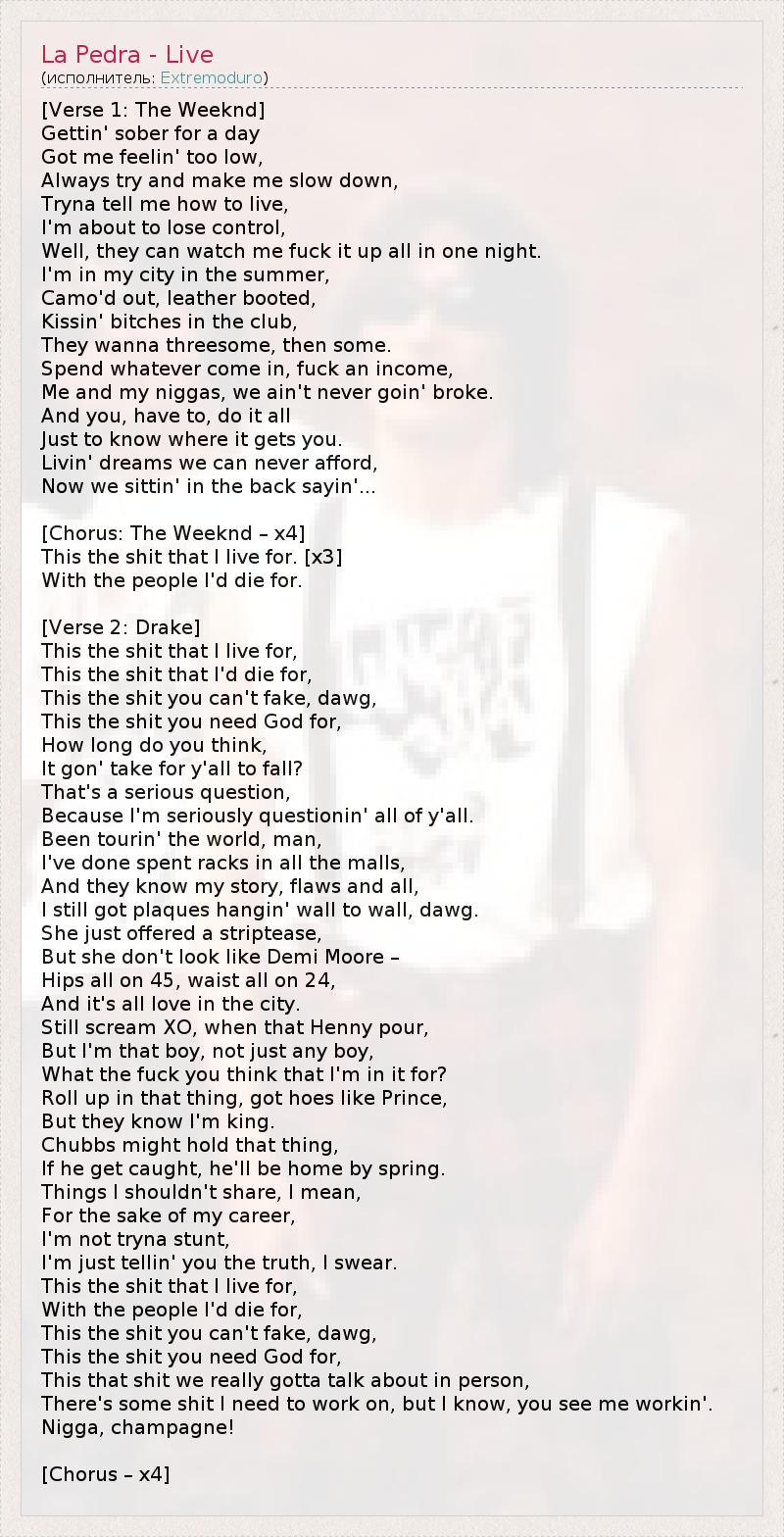 [Verse 1: The Weeknd] Gettin' sober for a day Got me feelin' too low, Always try and make me slow down, Tryna tell me how to live, I'm about to lose control, Well, they can watch me fuck it up all in one night. I'm in my city in the summer, Camo'd out, leather booted, Kissin' bitches in the club, They wanna threesome, then some. Spend whatever come in, fuck an income, Me and my niggas, we ain't never goin' broke. And you, have to, do it all Just to know where it gets you. Livin' dreams we can never afford, Now we sittin' in the back sayin'... [Chorus: The Weeknd – x4] This the shit that I live for. [x3] With the people I'd die for. [Verse 2: Drake] This the shit that I live for, This the shit that I'd die for, This the shit you can't fake, dawg, This the shit you need God for, How long do you think, It gon' take for y'all to fall? That's a serious question, Because I'm seriously questionin' all of y'all. Been tourin' the world, man, I've done spent racks in all the malls, And they know my story, flaws and all, I still got plaques hangin' wall to wall, dawg. She just offered a striptease, But she don't look like Demi Moore – Hips all on 45, waist all on 24, And it's all love in the city. Still scream XO, when that Henny pour, But I'm that boy, not just any boy, What the fuck you think that I'm in it for? Roll up in that thing, got hoes like Prince, But they know I'm king. Chubbs might hold that thing, If he get caught, he'll be home by spring. Things I shouldn't share, I mean, For the sake of my career, I'm not tryna stunt, I'm just tellin' you the truth, I swear. This the shit that I live for, With the people I'd die for, This the shit you can't fake, dawg, This the shit you need God for, This that shit we really gotta talk about in person, There's some shit I need to work on, but I know, you see me workin'. Nigga, champagne! [Chorus – x4]