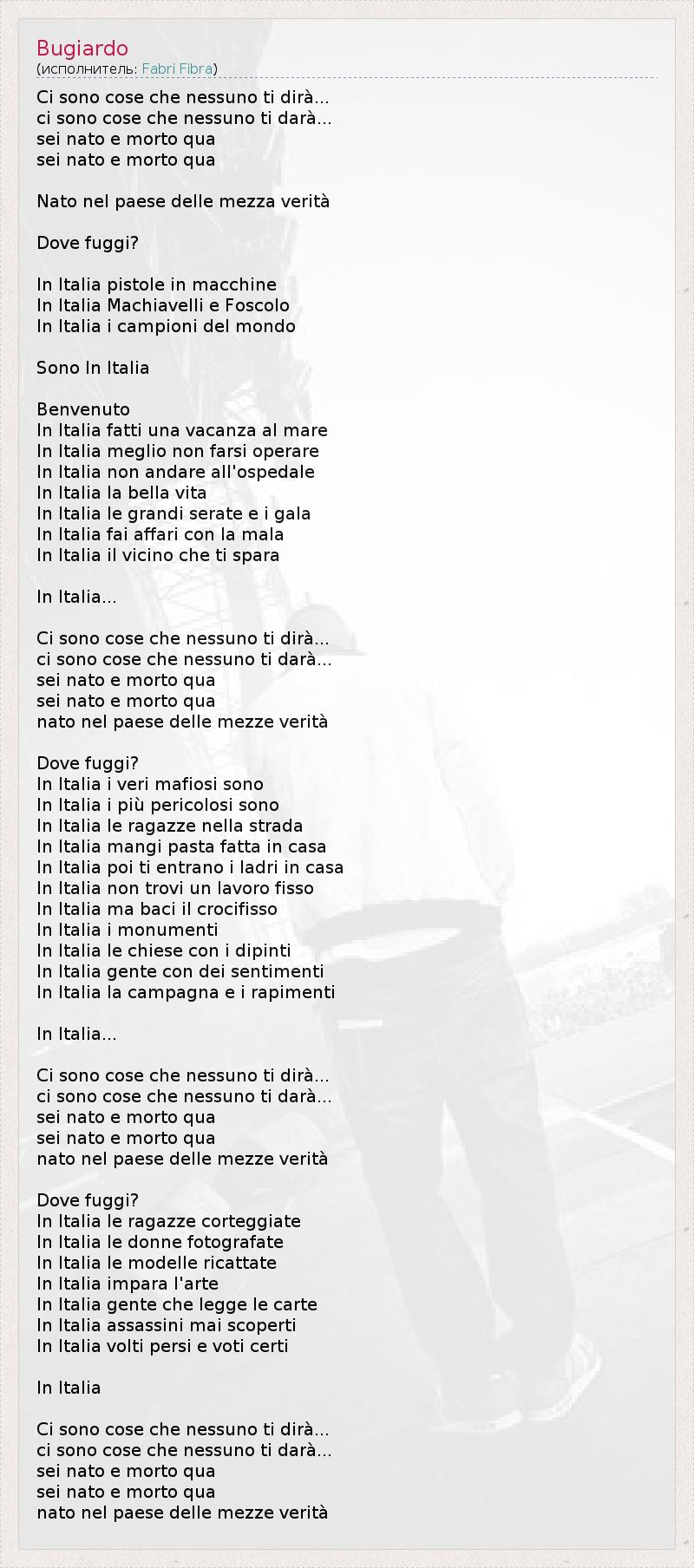 Это интересно:Фабрицио Тардуччи (Fabrizio Tarducci) – итальянский rapper, более известный как Fabri Fibra (Сенигаллия, 17 октября 1976). Фабри – старший брат другого итальянского rapper’а Nesly Rice.Начало пути: подростком начал интересоваться музыкой: первую запись сделал в 17 лет. Отличительная черта Фабри – это изменение тональности его голоса (особенно это слышно в альбоме «Mr. Simpatia») как в студийных записях, так и в... продолжение