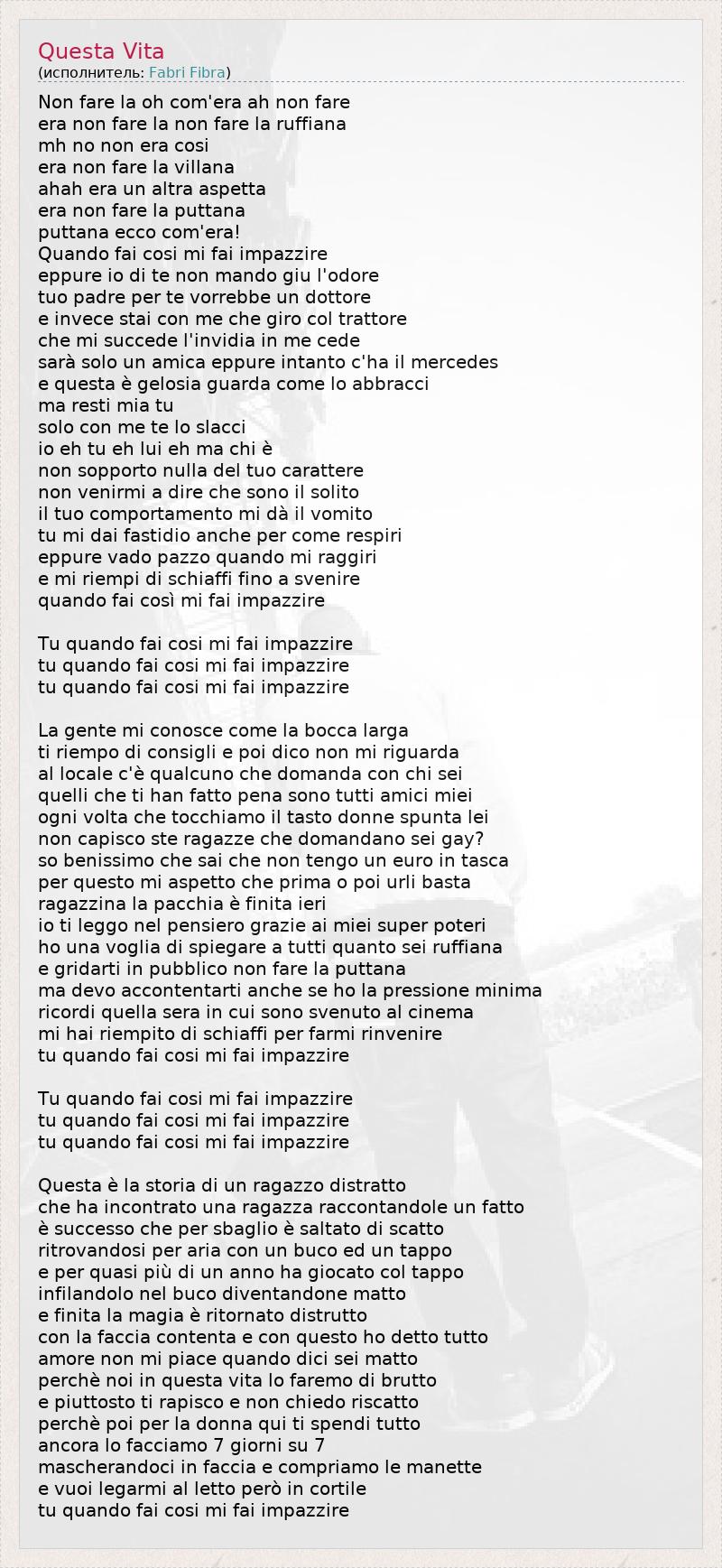 Non fare la oh com'era ah non fare era non fare la non fare la ruffiana mh no non era cosi era non fare la villana ahah era un altra aspetta era non fare la puttana puttana ecco com'era! Quando fai cosi mi fai impazzire eppure io di te non mando giu l'odore tuo padre per te vorrebbe un dottore e invece stai con me che giro col trattore che mi succede l'invidia in me cede sarà solo un amica eppure intanto c'ha il mercedes e questa è gelosia guarda come lo abbracci ma resti mia tu solo con me te lo slacci io eh tu eh lui eh ma chi è non sopporto nulla del tuo carattere non venirmi a dire che sono il solito il tuo comportamento mi dà il vomito tu mi dai fastidio anche per come respiri eppure vado pazzo quando mi raggiri e mi riempi di schiaffi fino a svenire quando fai così mi fai impazzire Tu quando fai cosi mi fai impazzire tu quando fai cosi mi fai impazzire tu quando fai cosi mi fai impazzire La gente mi conosce come la bocca larga ti riempo di consigli e poi dico non mi riguarda al locale c'è qualcuno che domanda con chi sei quelli che ti han fatto pena sono tutti amici miei ogni volta che tocchiamo il tasto donne spunta lei non capisco ste ragazze che domandano sei gay? so benissimo che sai che non tengo un euro in tasca per questo mi aspetto che prima o poi urli basta ragazzina la pacchia è finita ieri io ti leggo nel pensiero grazie ai miei super poteri ho una voglia di spiegare a tutti quanto sei ruffiana e gridarti in pubblico non fare la puttana ma devo accontentarti anche se ho la pressione minima ricordi quella sera in cui sono svenuto al cinema mi hai riempito di schiaffi per farmi rinvenire tu quando fai cosi mi fai impazzire Tu quando fai cosi mi fai impazzire tu quando fai cosi mi fai impazzire tu quando fai cosi mi fai impazzire Questa è la storia di un ragazzo distratto che ha incontrato una ragazza raccontandole un fatto è successo che per sbaglio è saltato di scatto ritrovandosi per aria con un buco ed un tappo e per quasi più di un anno ha giocato col tappo infilandolo nel buco diventandone matto e finita la magia è ritornato distrutto con la faccia contenta e con questo ho detto tutto amore non mi piace quando dici sei matto perchè noi in questa vita lo faremo di brutto e piuttosto ti rapisco e non chiedo riscatto perchè poi per la donna qui ti spendi tutto ancora lo facciamo 7 giorni su 7 mascherandoci in faccia e compriamo le manette e vuoi legarmi al letto però in cortile tu quando fai cosi mi fai impazzire