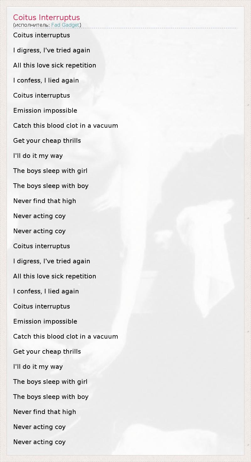 Coitus interruptus I digress, I've tried again All this love sick repetition I confess, I lied again Coitus interruptus Emission impossible Catch this blood clot in a vacuum Get your cheap thrills I'll do it my way The boys sleep with girl The boys sleep with boy Never find that high Never acting coy Never acting coy Coitus interruptus I digress, I've tried again All this love sick repetition I confess, I lied again Coitus interruptus Emission impossible Catch this blood clot in a vacuum Get your cheap thrills I'll do it my way The boys sleep with girl The boys sleep with boy Never find that high Never acting coy Never acting coy