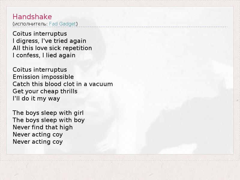 Coitus interruptus I digress, I've tried again All this love sick repetition I confess, I lied again Coitus interruptus Emission impossible Catch this blood clot in a vacuum Get your cheap thrills I'll do it my way The boys sleep with girl The boys sleep with boy Never find that high Never acting coy Never acting coy
