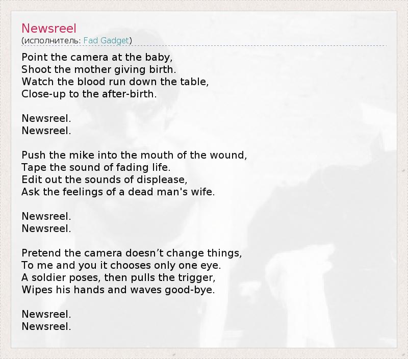Point the camera at the baby, Shoot the mother giving birth. Watch the blood run down the table, Close-up to the after-birth. Newsreel. Newsreel. Push the mike into the mouth of the wound, Tape the sound of fading life. Edit out the sounds of displease, Ask the feelings of a dead man's wife. Newsreel. Newsreel. Pretend the camera doesn’t change things, To me and you it chooses only one eye. A soldier poses, then pulls the trigger, Wipes his hands and waves good-bye. Newsreel. Newsreel.