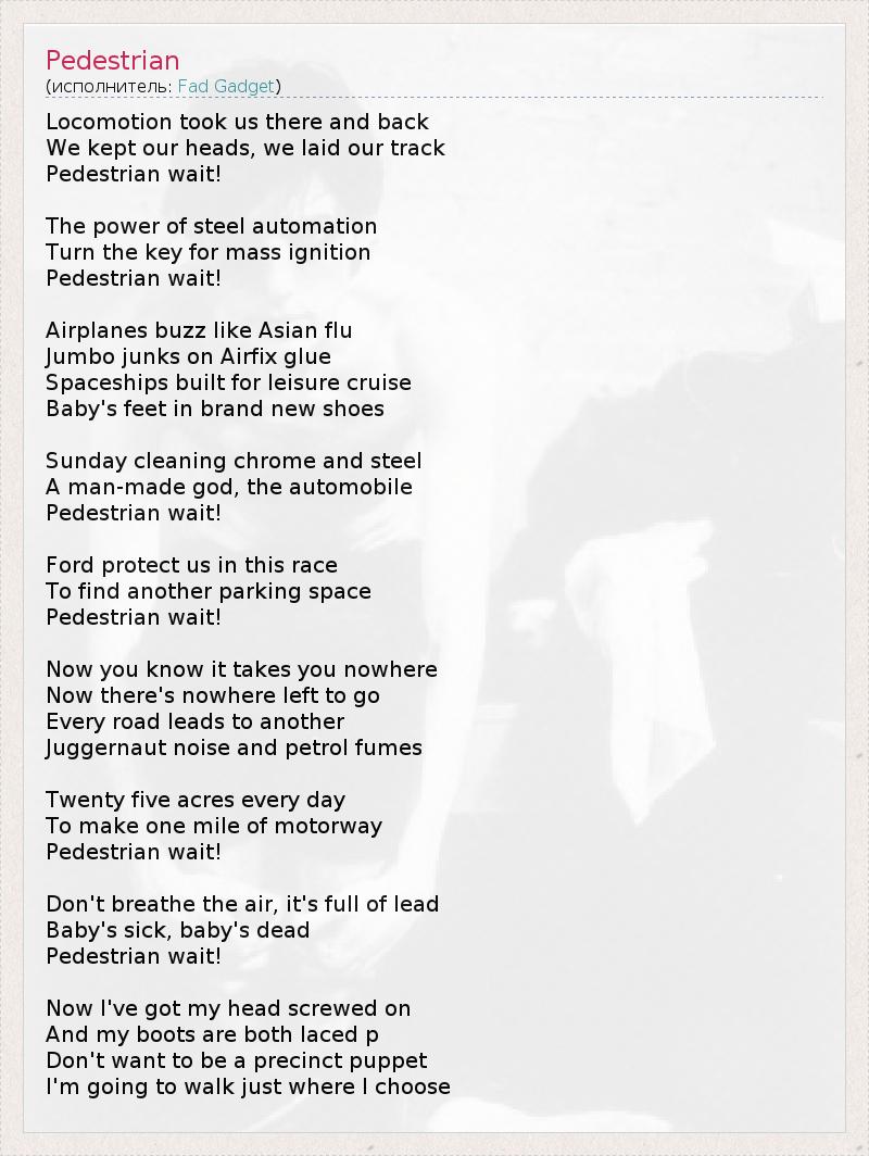 Locomotion took us there and back We kept our heads, we laid our track Pedestrian wait! The power of steel automation Turn the key for mass ignition Pedestrian wait! Airplanes buzz like Asian flu Jumbo junks on Airfix glue Spaceships built for leisure cruise Baby's feet in brand new shoes Sunday cleaning chrome and steel A man-made god, the automobile Pedestrian wait! Ford protect us in this race To find another parking space Pedestrian wait! Now you know it takes you nowhere Now there's nowhere left to go Every road leads to another Juggernaut noise and petrol fumes Twenty five acres every day To make one mile of motorway Pedestrian wait! Don't breathe the air, it's full of lead Baby's sick, baby's dead Pedestrian wait! Now I've got my head screwed on And my boots are both laced p Don't want to be a precinct puppet I'm going to walk just where I choose