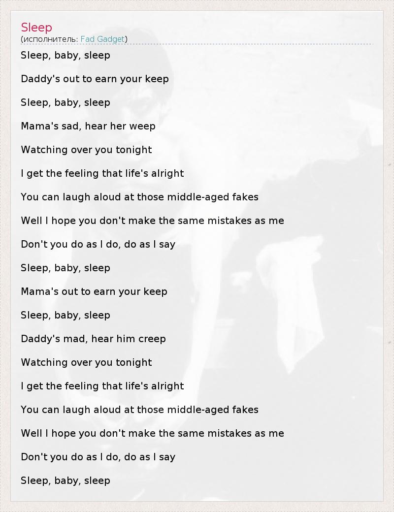 Sleep, baby, sleep Daddy's out to earn your keep Sleep, baby, sleep Mama's sad, hear her weep Watching over you tonight I get the feeling that life's alright You can laugh aloud at those middle-aged fakes Well I hope you don't make the same mistakes as me Don't you do as I do, do as I say Sleep, baby, sleep Mama's out to earn your keep Sleep, baby, sleep Daddy's mad, hear him creep Watching over you tonight I get the feeling that life's alright You can laugh aloud at those middle-aged fakes Well I hope you don't make the same mistakes as me Don't you do as I do, do as I say Sleep, baby, sleep