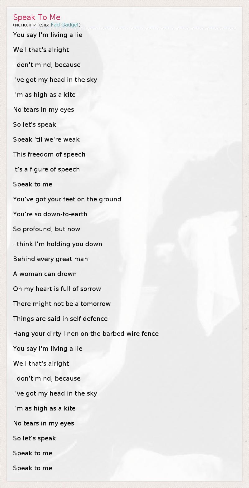 You say I'm living a lie Well that's alright I don't mind, because I've got my head in the sky I'm as high as a kite No tears in my eyes So let's speak Speak 'til we're weak This freedom of speech It's a figure of speech Speak to me You've got your feet on the ground You're so down-to-earth So profound, but now I think I'm holding you down Behind every great man A woman can drown Oh my heart is full of sorrow There might not be a tomorrow Things are said in self defence Hang your dirty linen on the barbed wire fence You say I'm living a lie Well that's alright I don't mind, because I've got my head in the sky I'm as high as a kite No tears in my eyes So let's speak Speak to me Speak to me